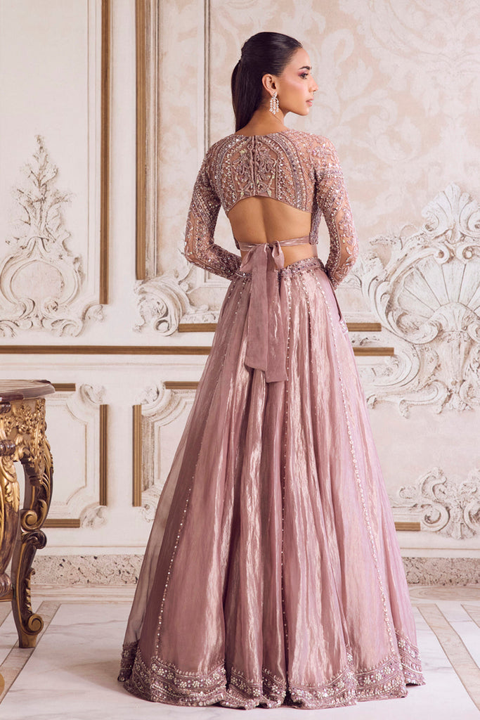 Champagne pure silk tissue lehenga with full sleeves hand embroidered blouse . The embroidery is a perfect blend of traditional and contemporary detailing.The lehenga has a scalloped border which features floral motifs and geometric patterns with cutdana, sequins, beads, mirrors. The lehenga makes a statement with pocket detailing on both sides. The lehenga is paired with a matching net dupatta with statement tassels at the palla.