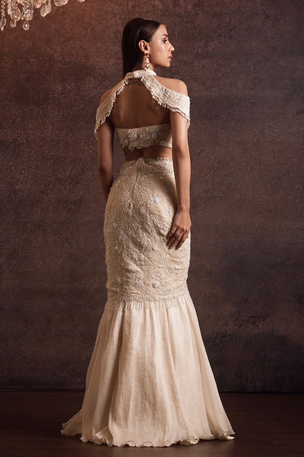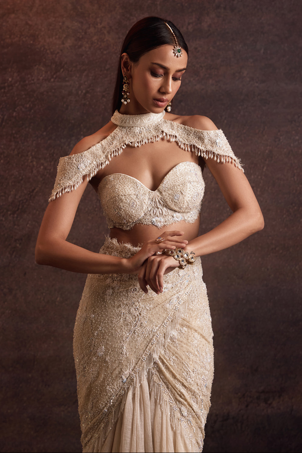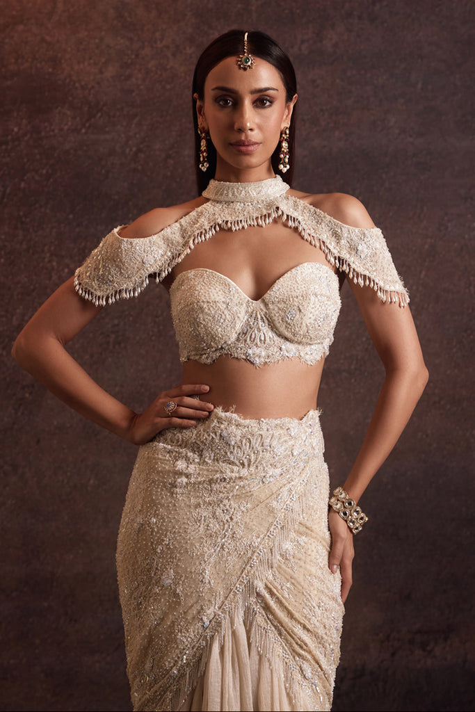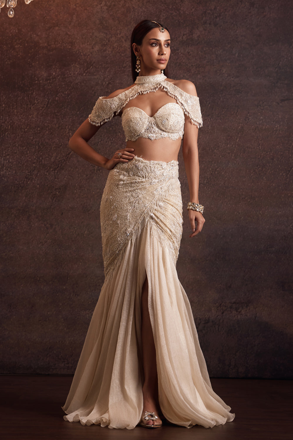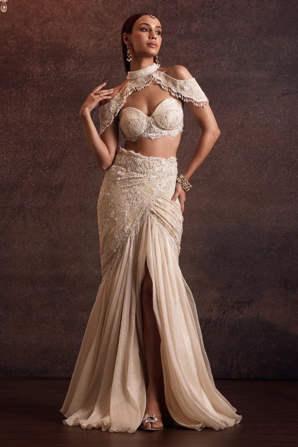 Naisha ecru Pearl cape and fishtail Slit skirt