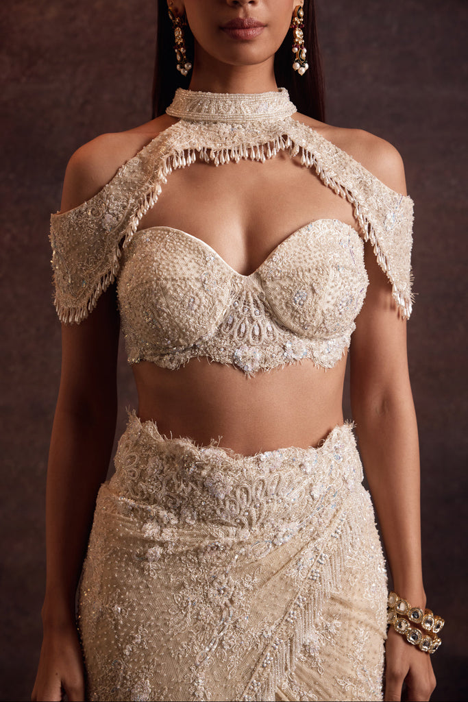 Cape: Cold shoulder embellished cape, hi neck, hook fastening at back // Bustier blouse: Fully embellished, padded, hook fastening at back // Skirt:Fish cut skirt, slit on left side of wearer, back zipper fastening, chantilly lace drape on hips area.