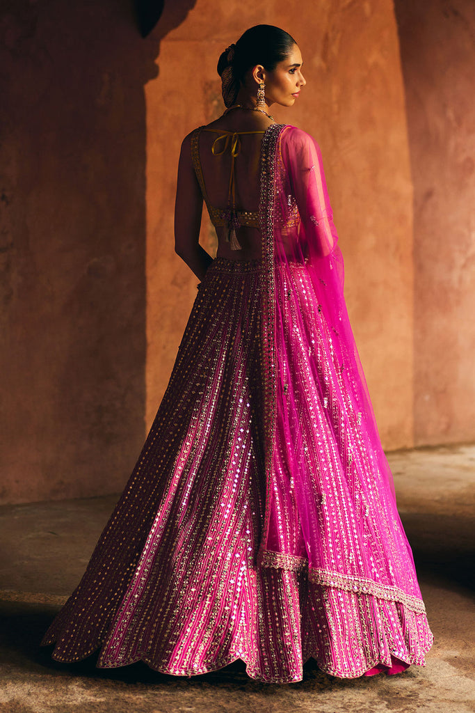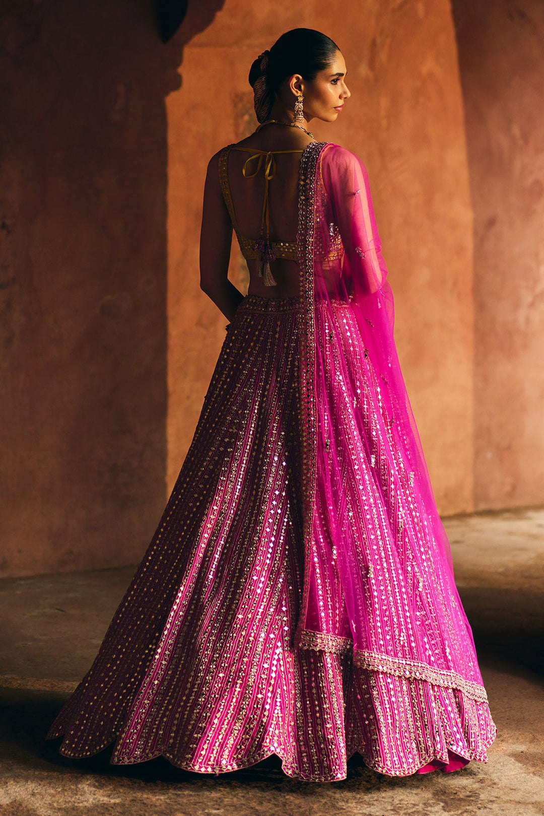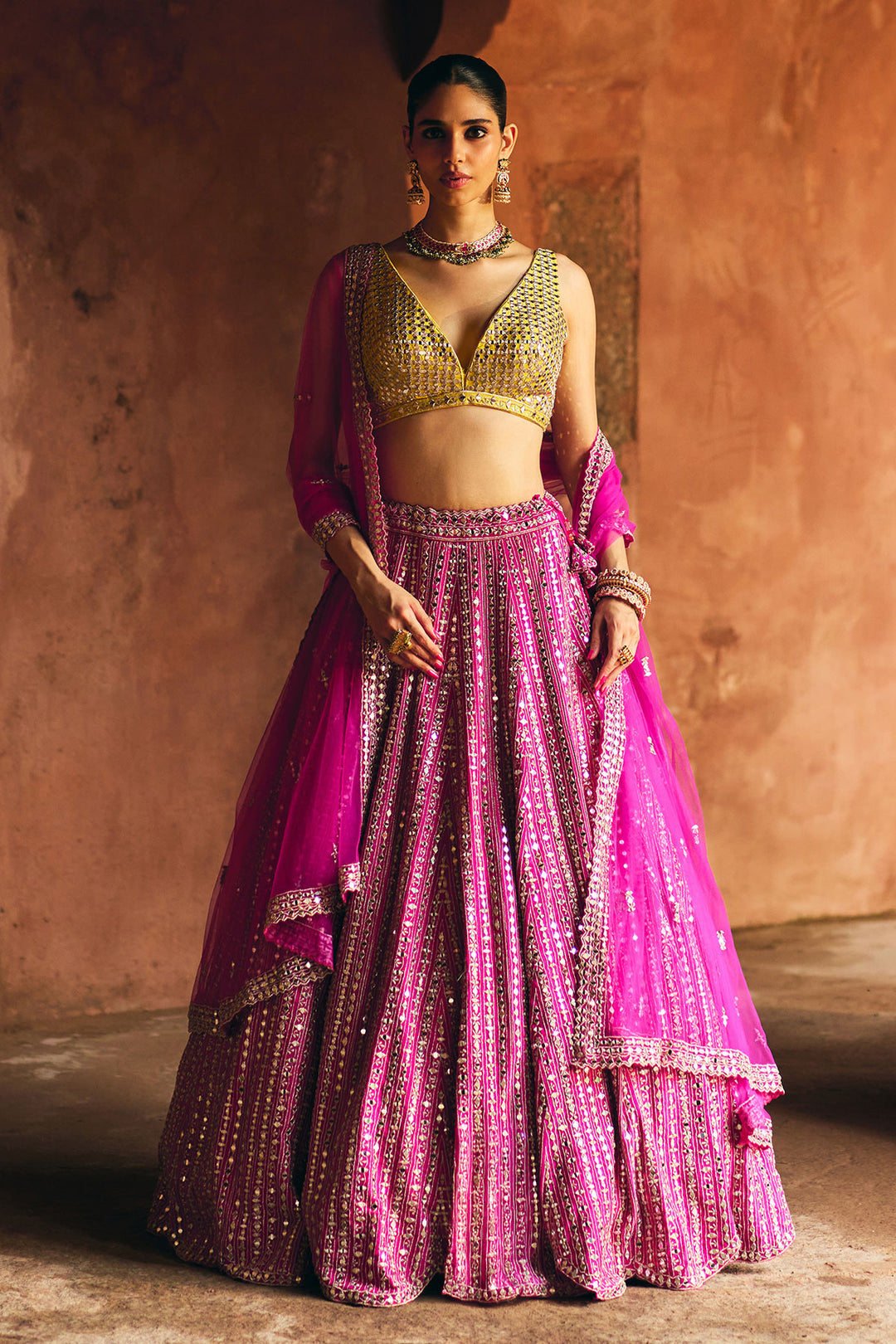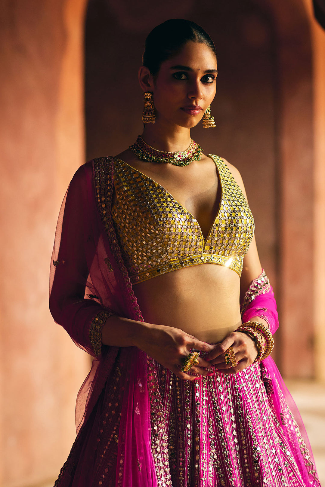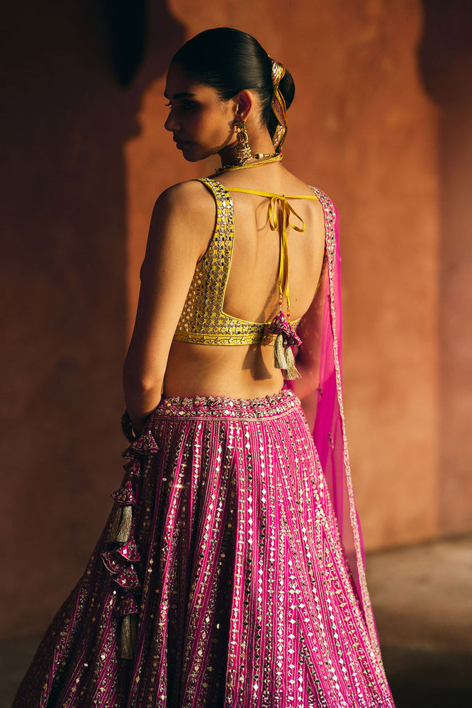 Fuchsia pink lehenga with linear mirror embroidery, paired with a lime yellow blouse and zari-gota finishing.