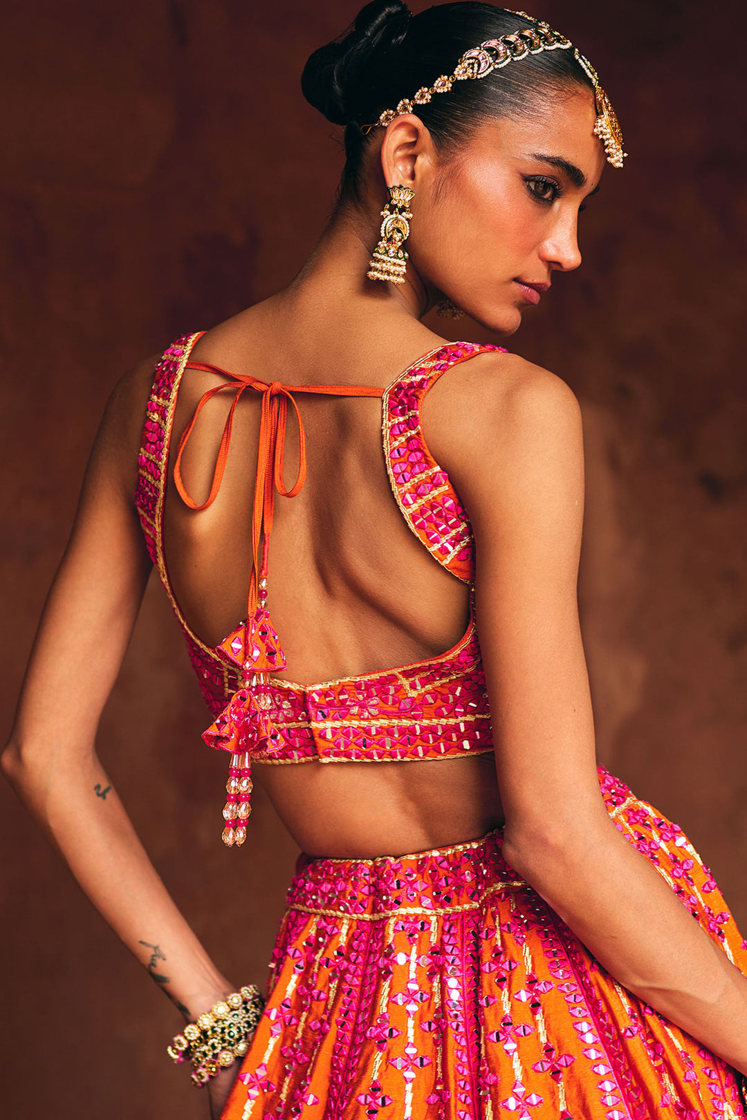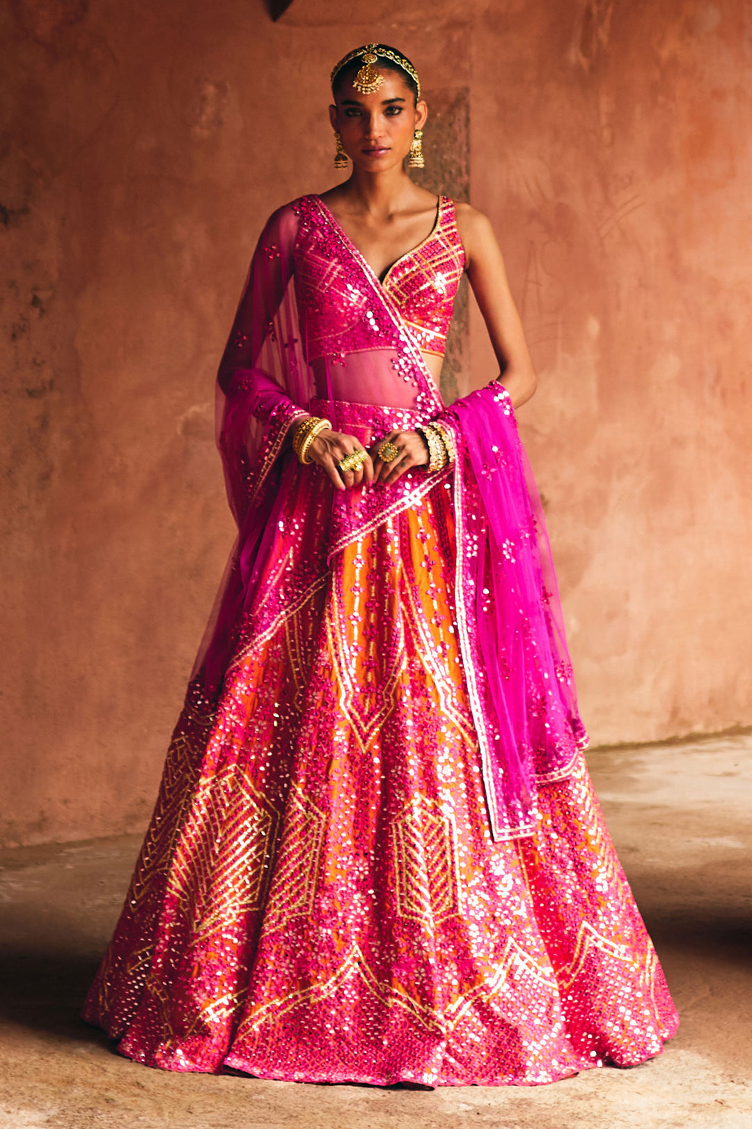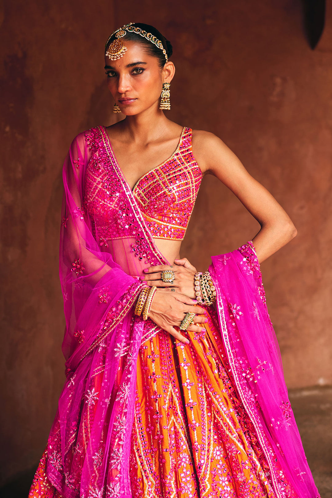 fiery fusion of rani pink and rust, adorned with bold mirror and threadwork embroidery for the modern statement bride.