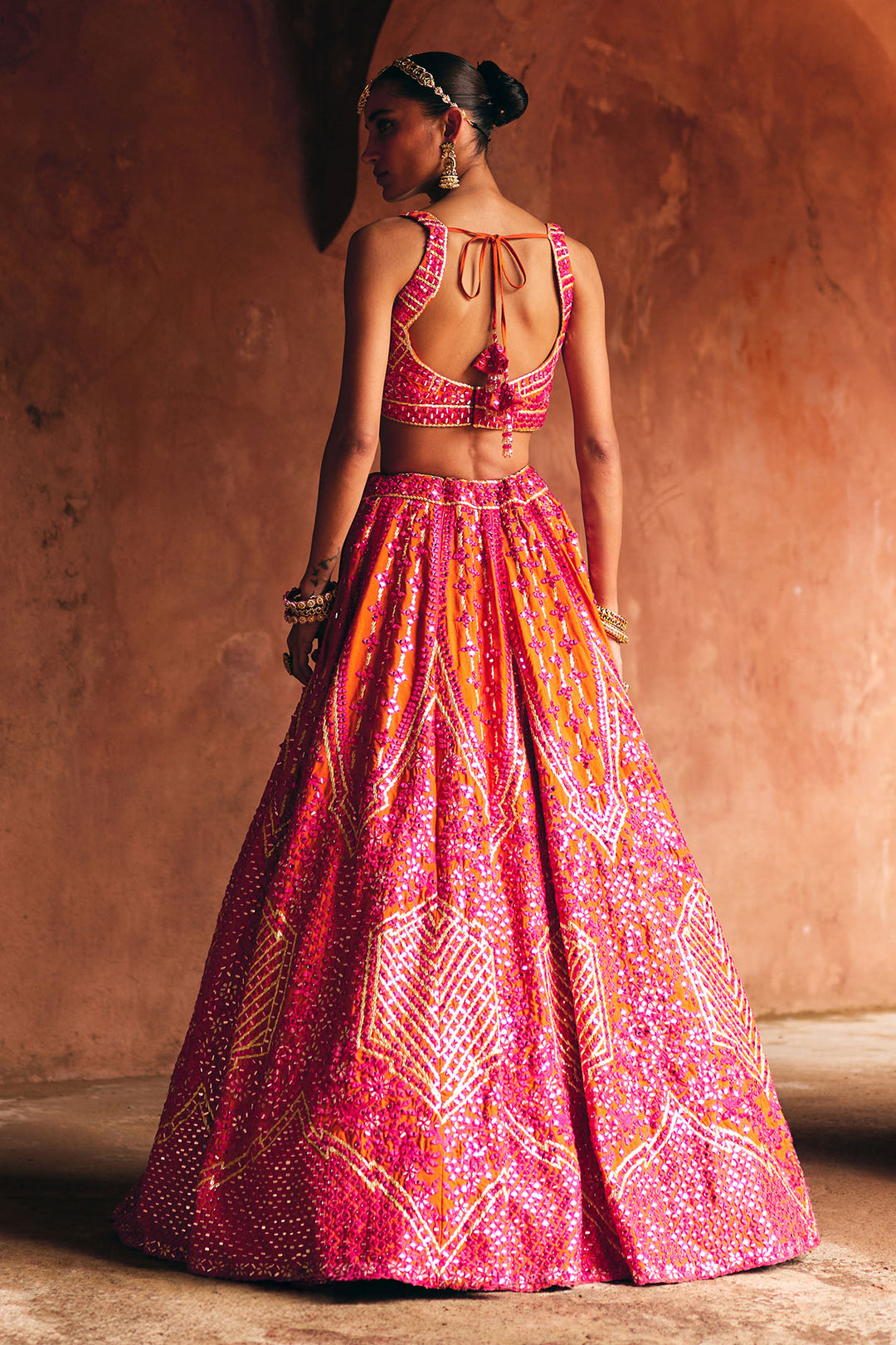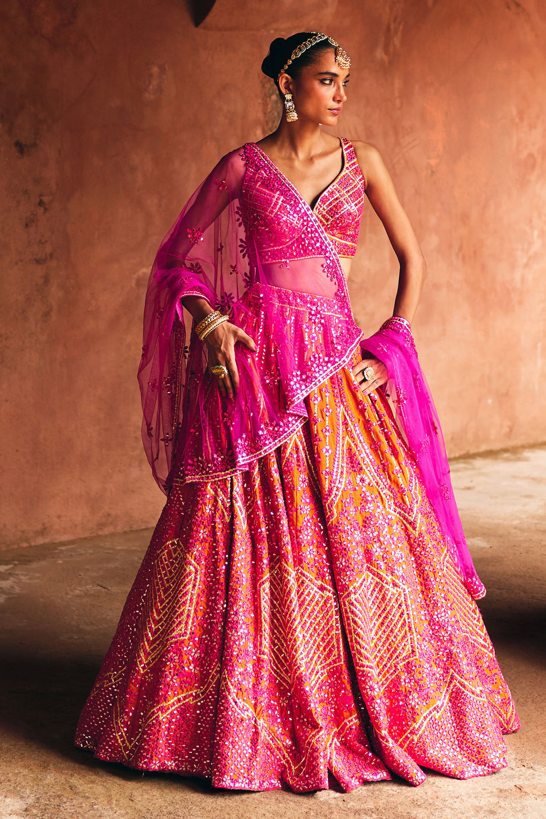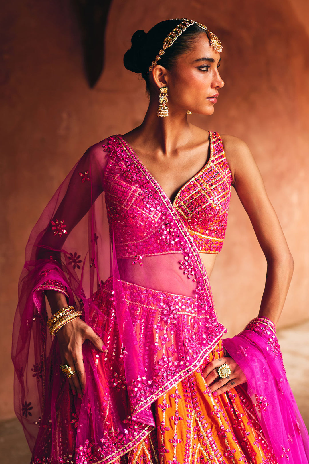 fiery fusion of rani pink and rust, adorned with bold mirror and threadwork embroidery for the modern statement bride.