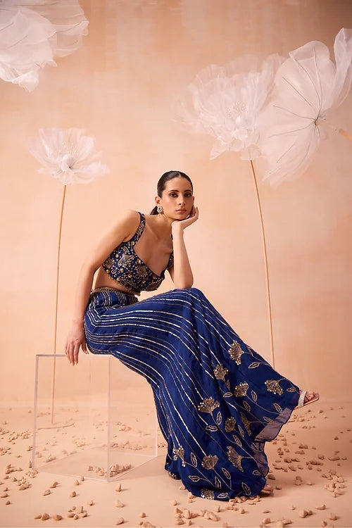 Mirror work hand embroidered blouse and pant set highlightened with zari sequine and cutdana work