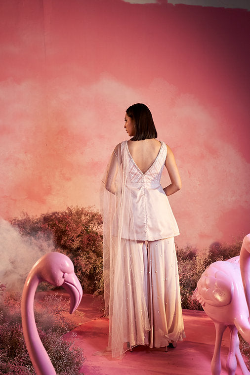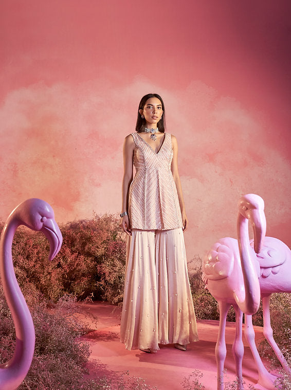 Kurta featuring V neckline and geometric pattern embroidery . Paired with sharara with pearl details And a dupatta