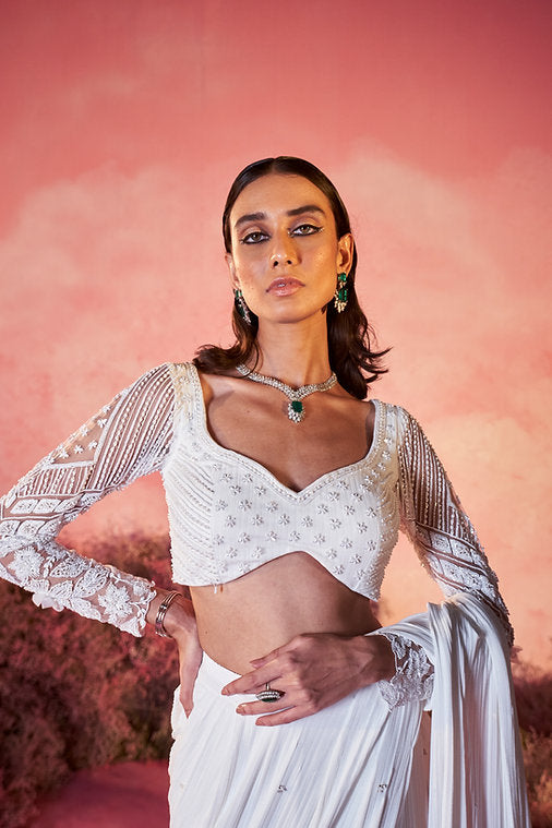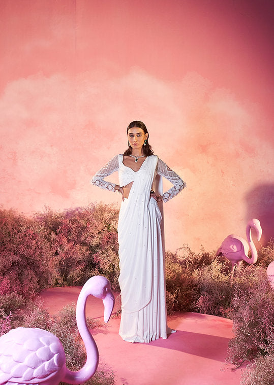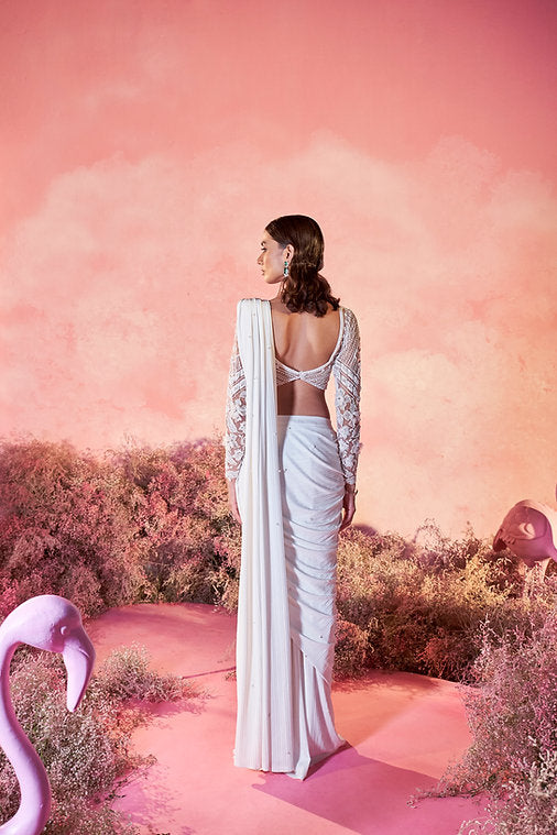 An elegant white drape saree with statement blouse featuring heavily embroidered sleeveย