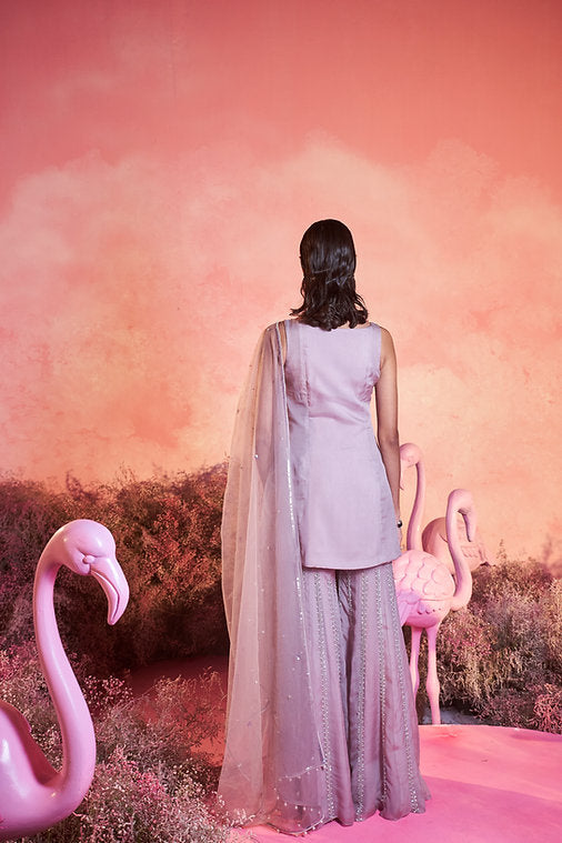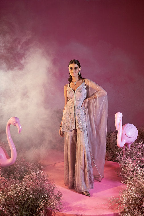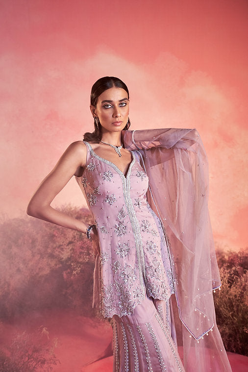 A beautiful sharara set embellished with zari and sequins. Comes with mesh dupatta