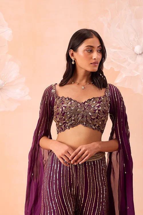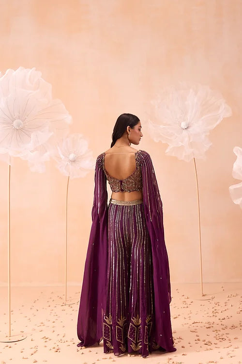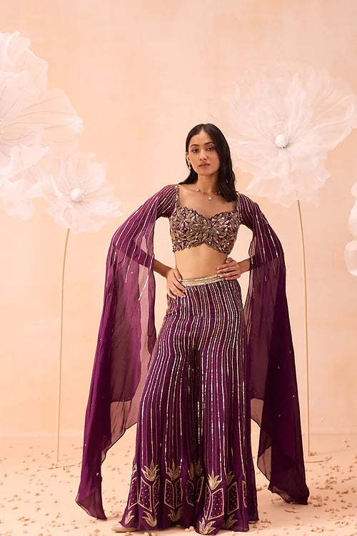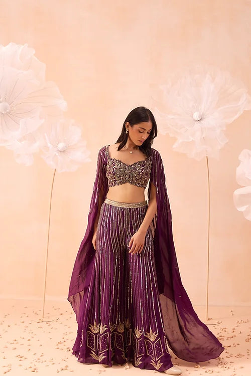 A sharara set embellished with zari and sequins work. Comes with embroidered blouse detailed cutwork on neckline and cape sleeves