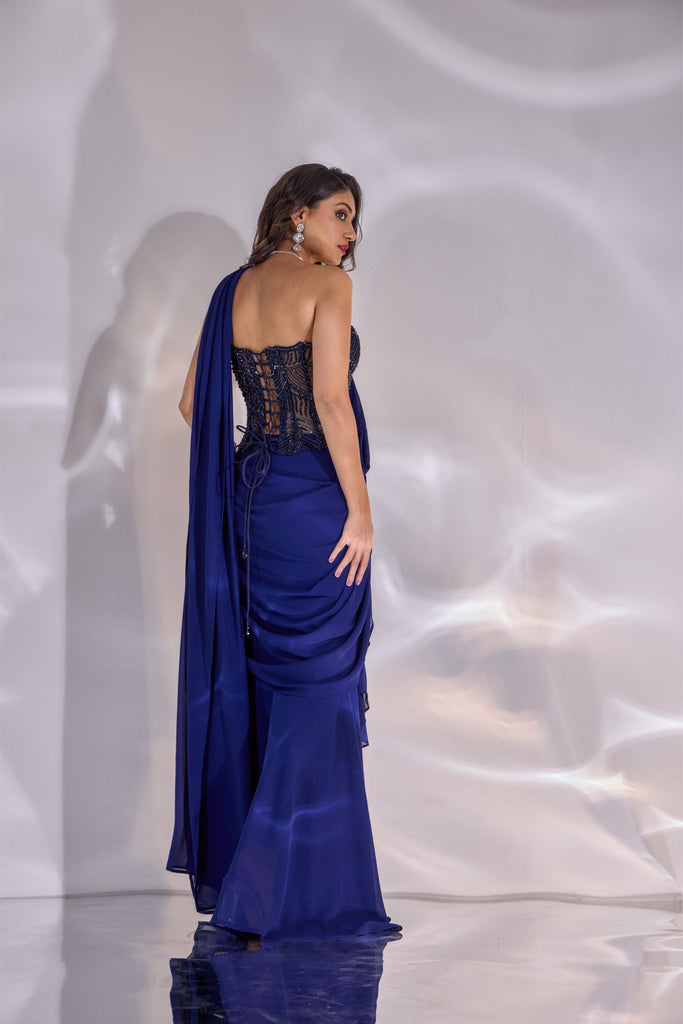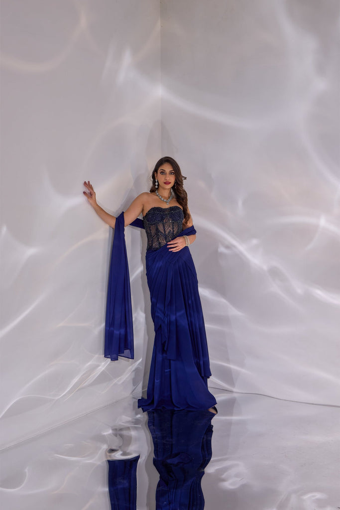 Dark Blue Chiffon Pre-Draped Saree paired with Hand Embellished Net Corset