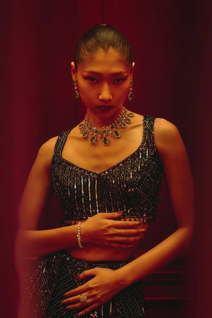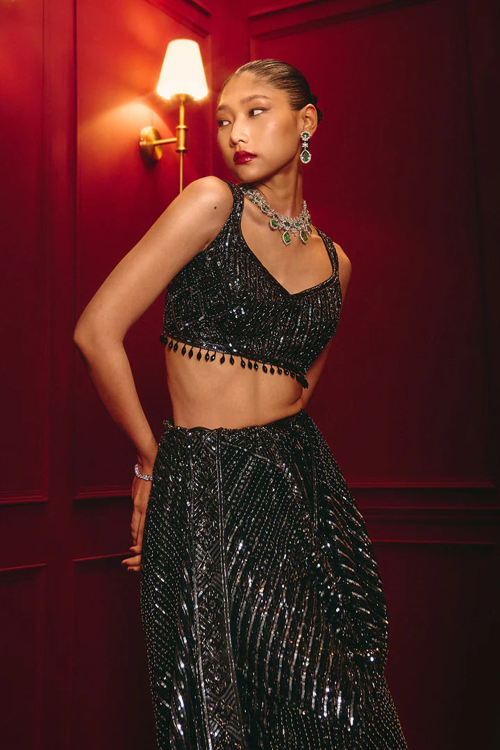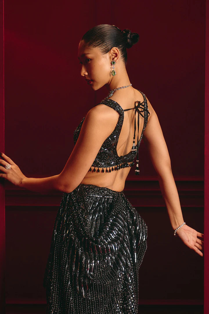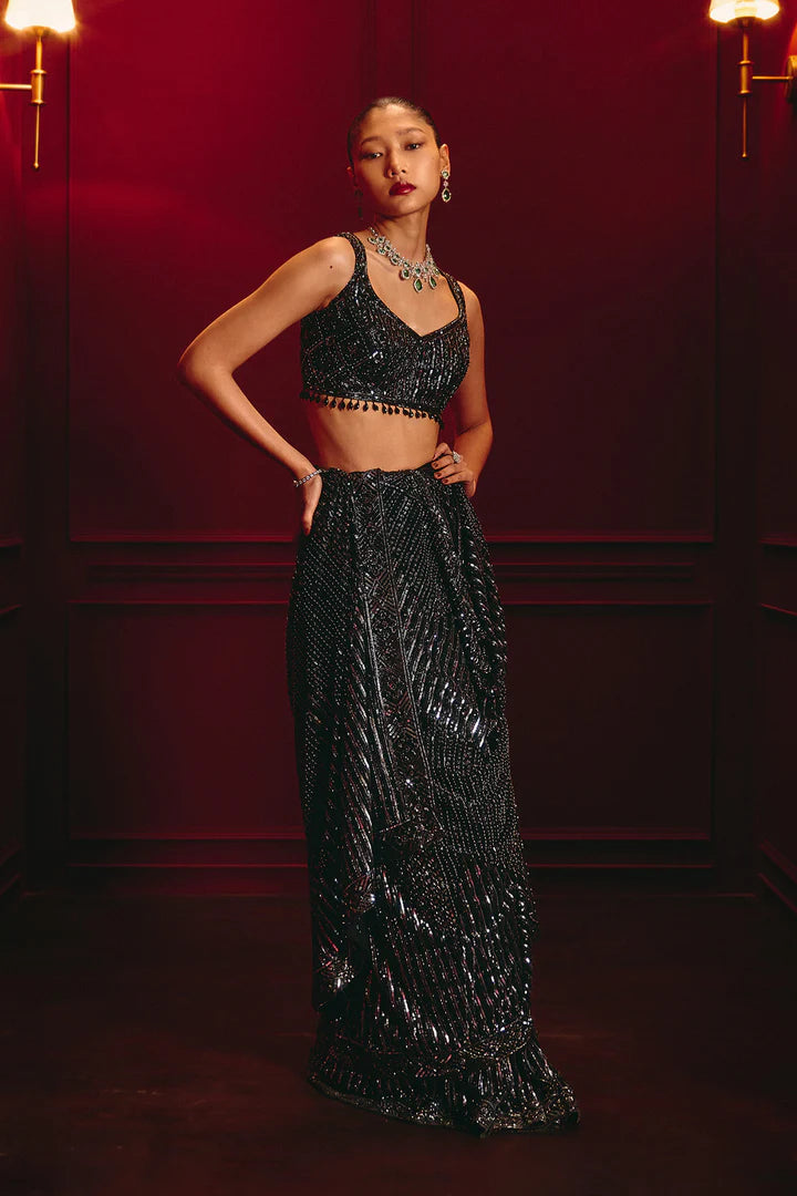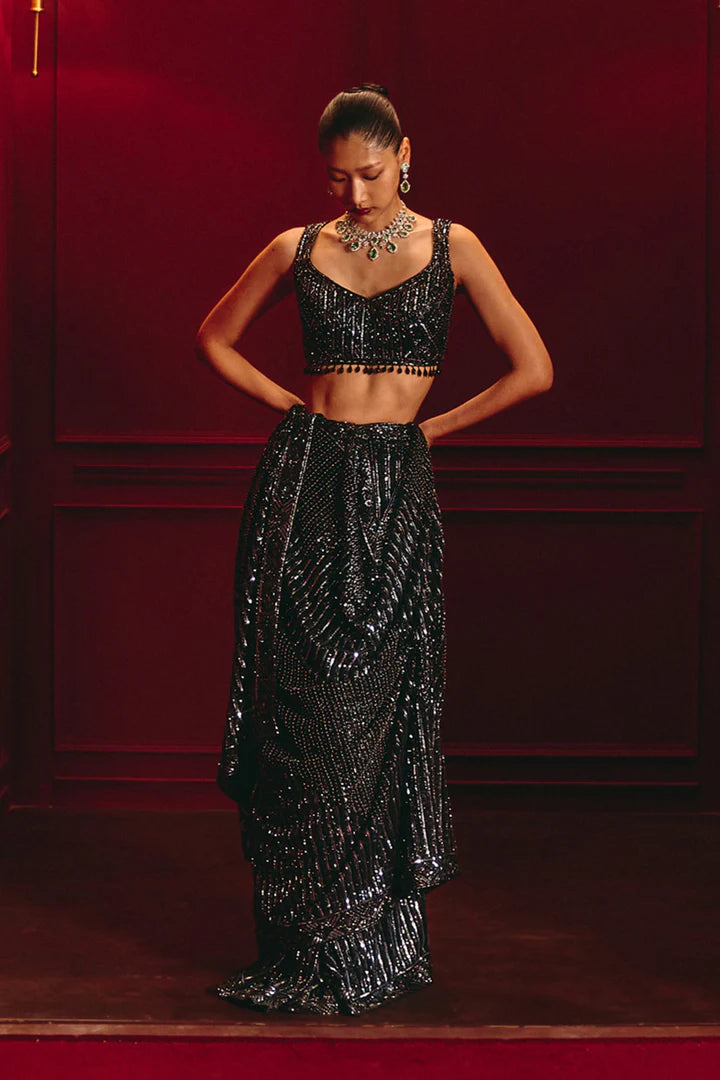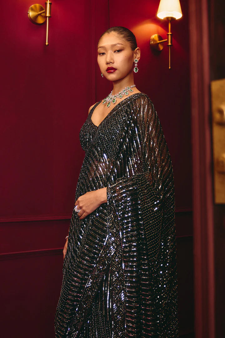 All-over sequin embroidery, Draped saree silhouette.