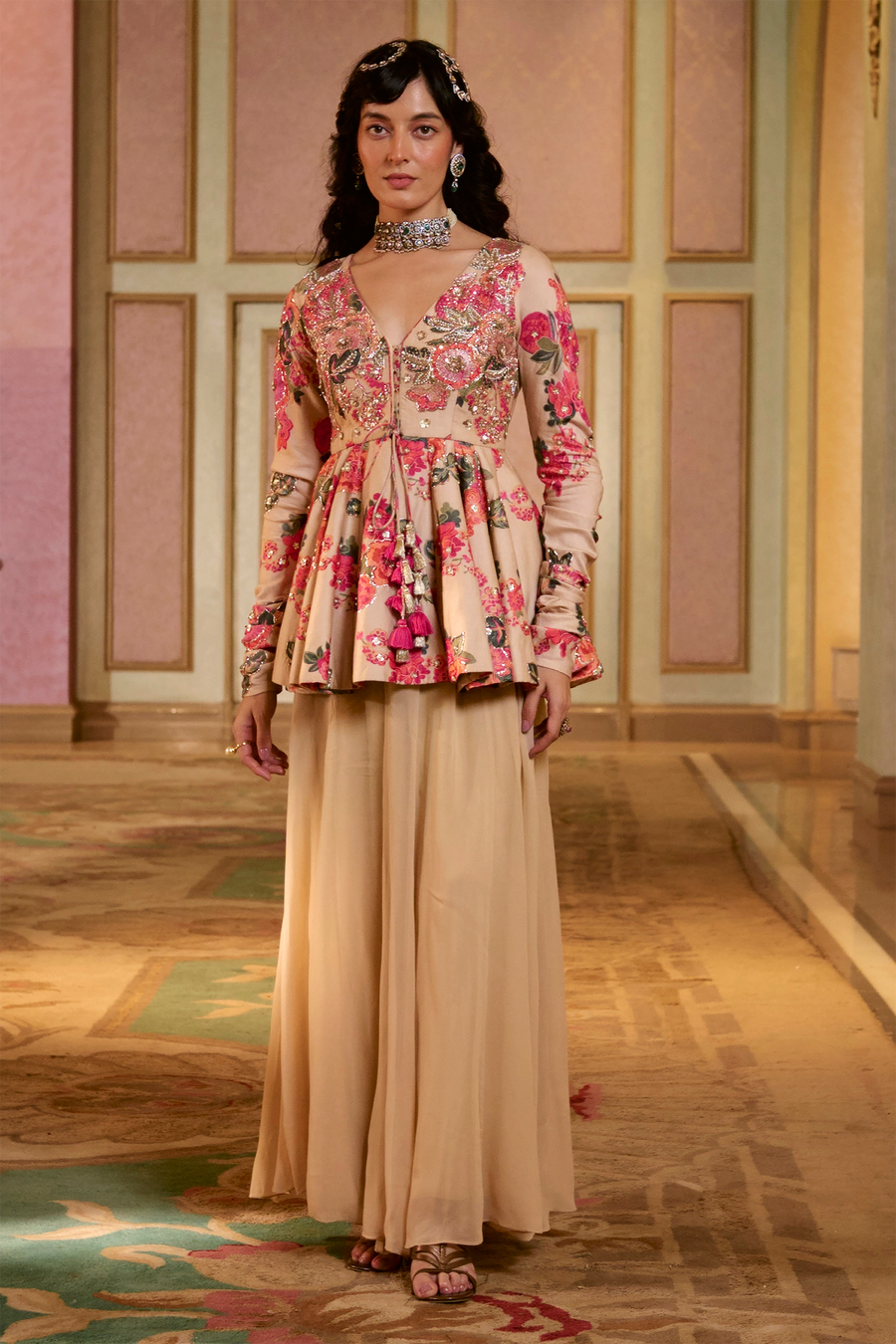Inspired by blooming florals, this modern peplum set features our signature silhouette in a soft pink and orange floral print. The yoke and sleeves are hand-embroidered in intricate zardozi, sequins, and finished with tassel detailing. The peplum is paired with solid palazzos.