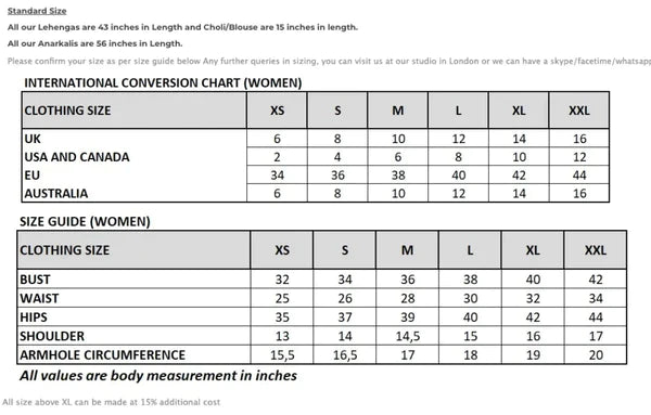 Custom sizing and outfit customizations, including colours and blouse changes, are available for most of our outfits.