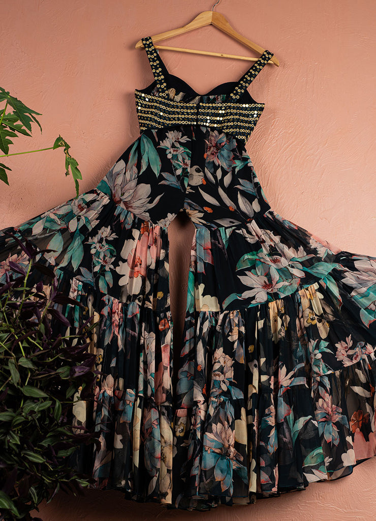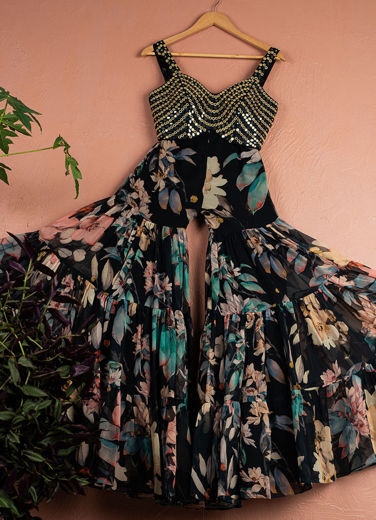 Sharara : Printed Floral Georgette, Blouse : Rawsilk , Blouse Emb : Mirrorwork & Threadwork, Dupatta : Net, Dupatta Border : Mirrorwork