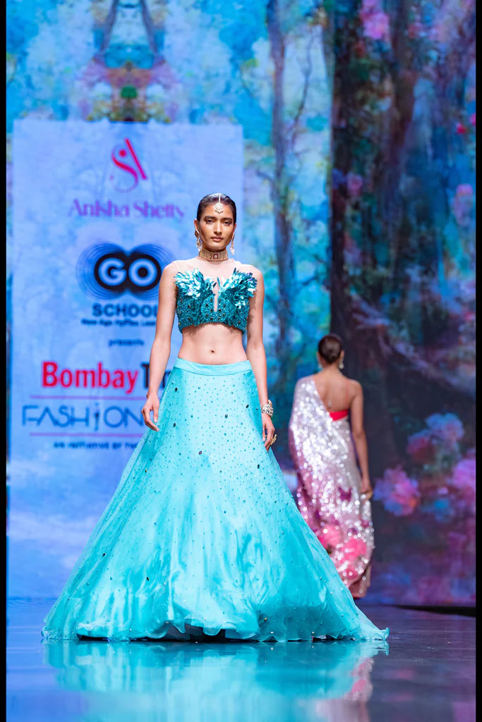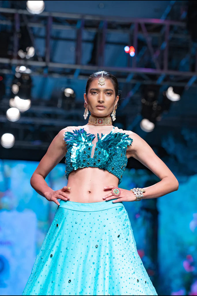 The Dawn Lehenga And Metalic Feather Sequence Crop Top Set In Teal Blue