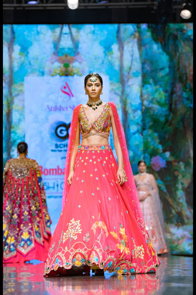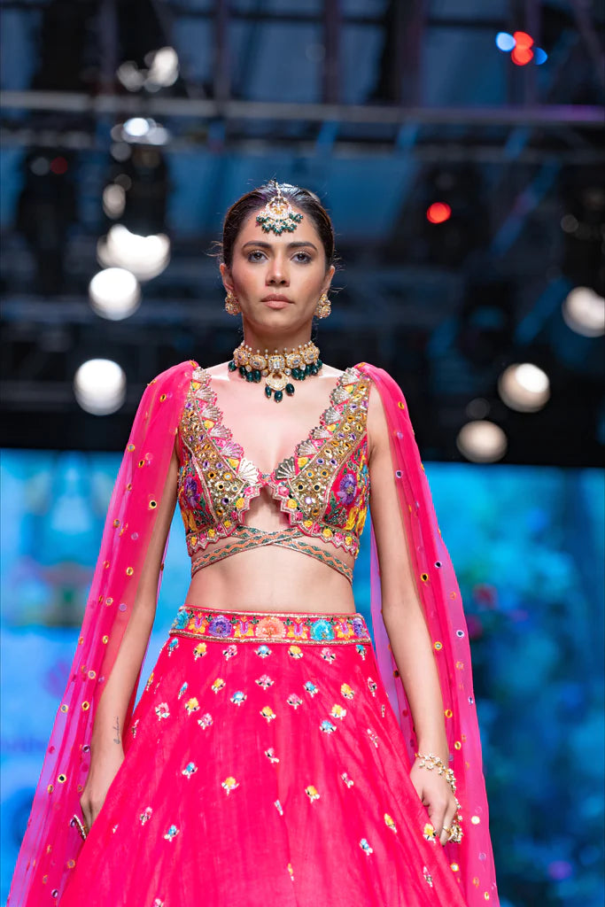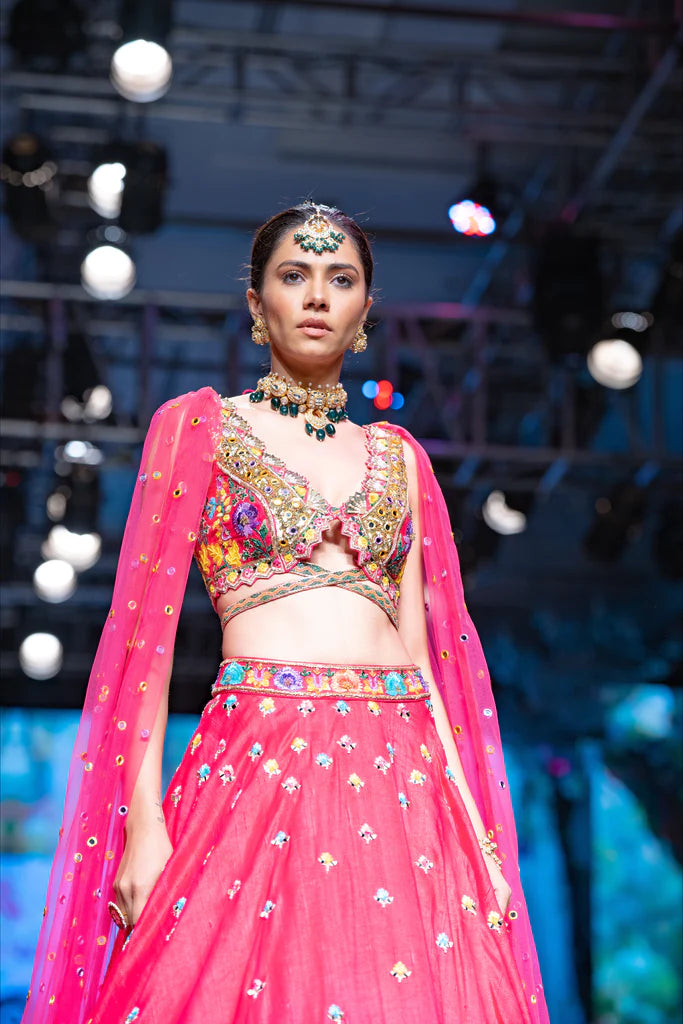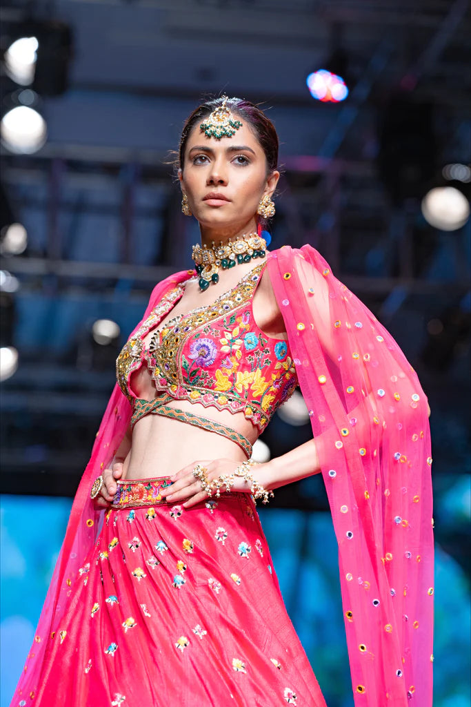 Lehenga : Rawsilk , Blouse : Rawsilk , Dupatta : Net , Emboidery : Metal Embellishments, Mirrorwork , Threadwork, Sequin Work, Cutdana Work