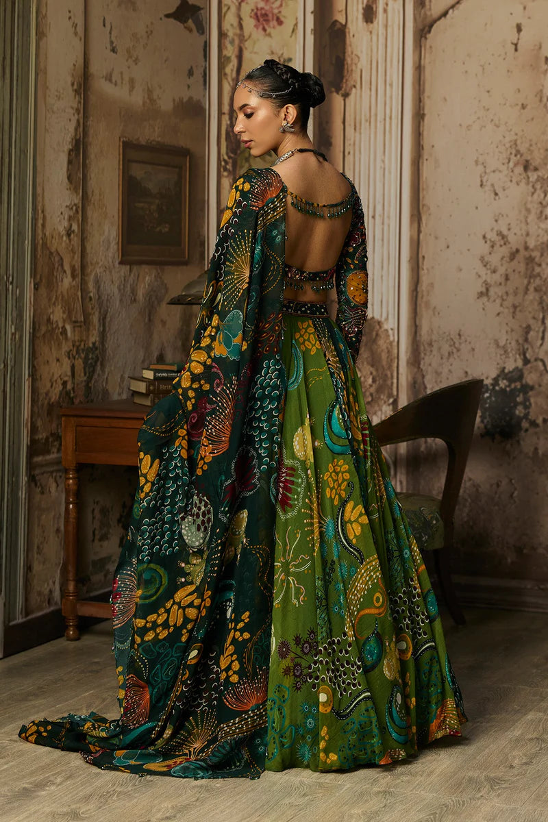 Dark Green Coral Veil Printed And Highlighted Blouse With Alternate Coral Veil Printed Lehenga & Tassel Detailed Dupatta