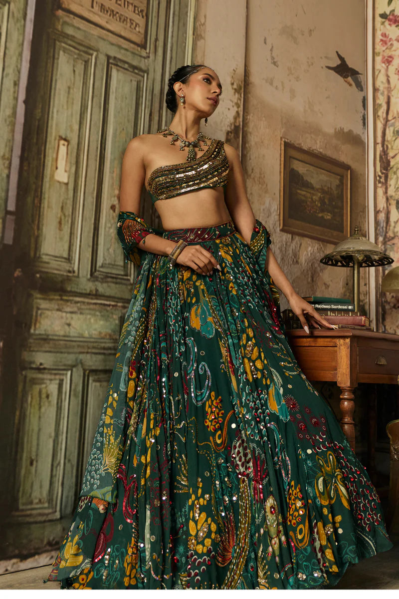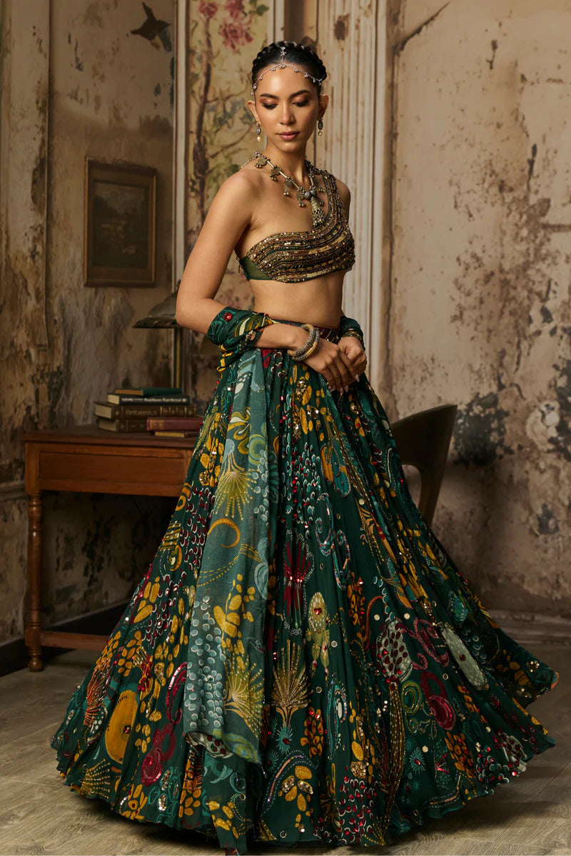 Dark Green Embellished Bouse With Printed And Highlighted Lehenga Set