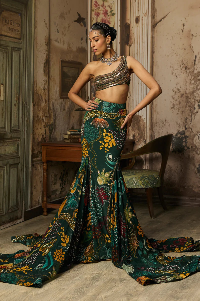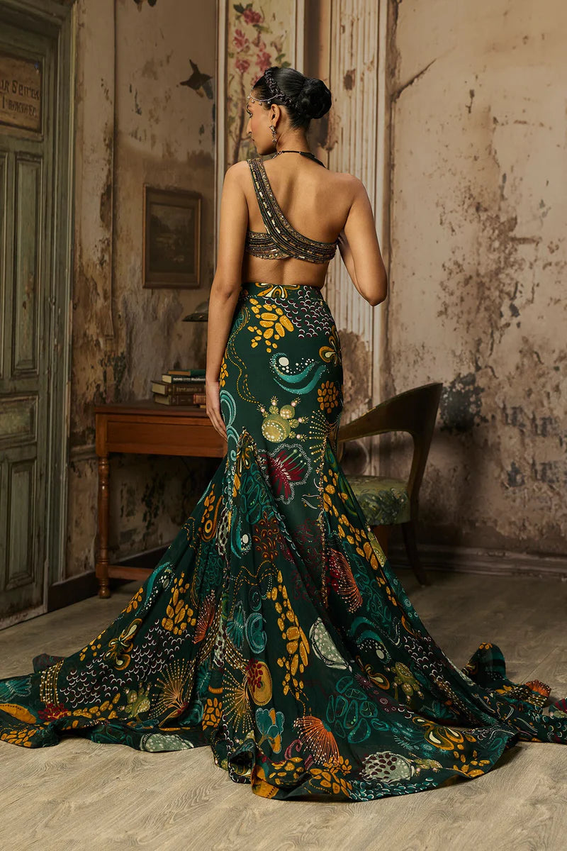 Dark Green Coral Veil Embroidered Blouse With Printed Fish Tail Skirt