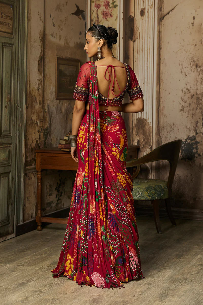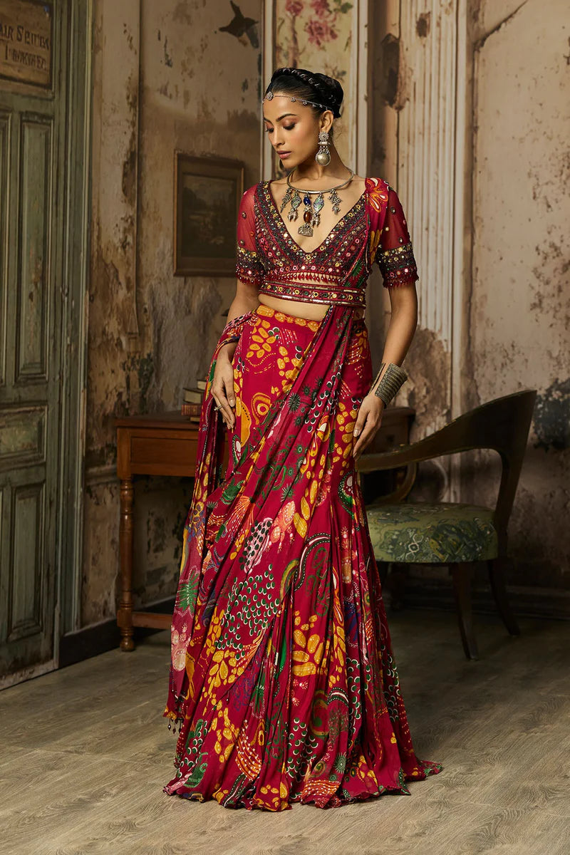 Deep Red Embroidered Blouse With Mermaid Skirt Saree Set
