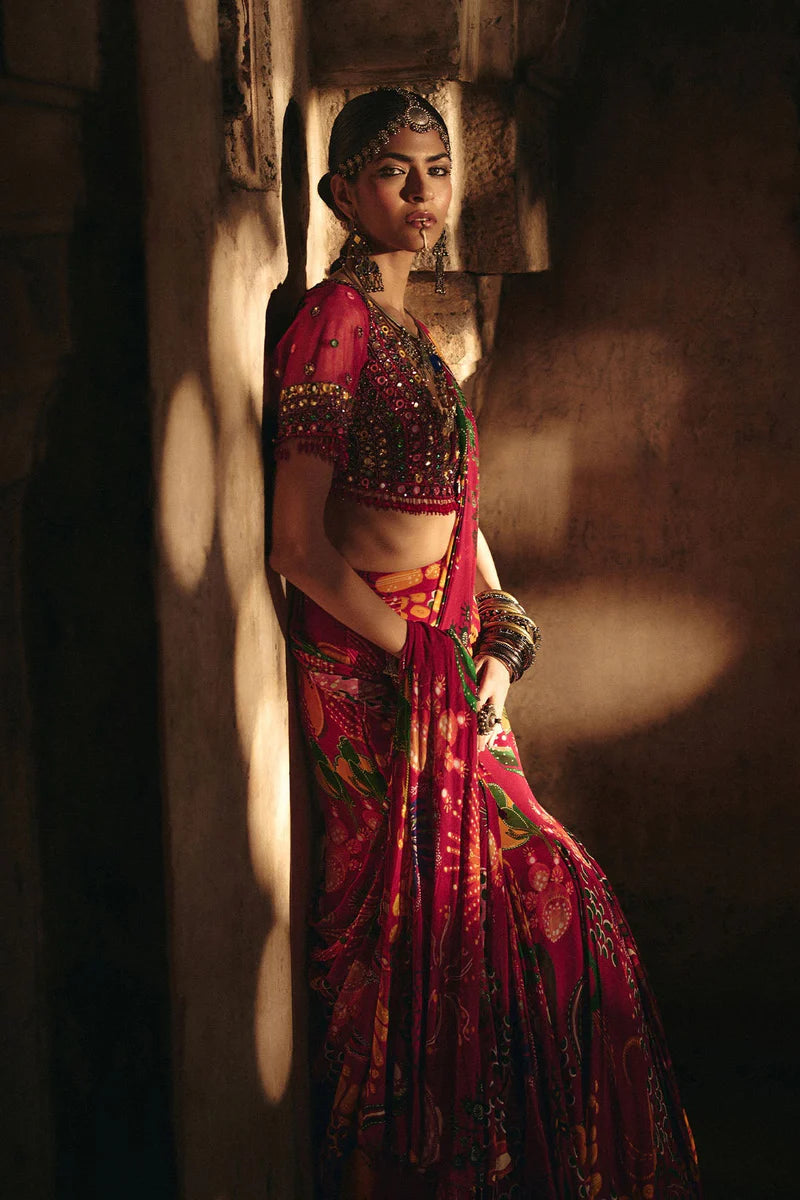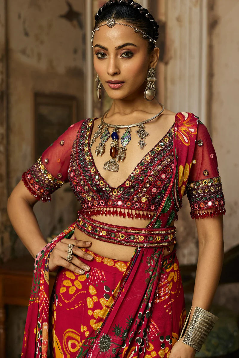 Deep Red Colorful Mirror Embroidered Blouse With Deep Red Coral Veil Printed Mermaid Saree Paired With An Embroidered Belt