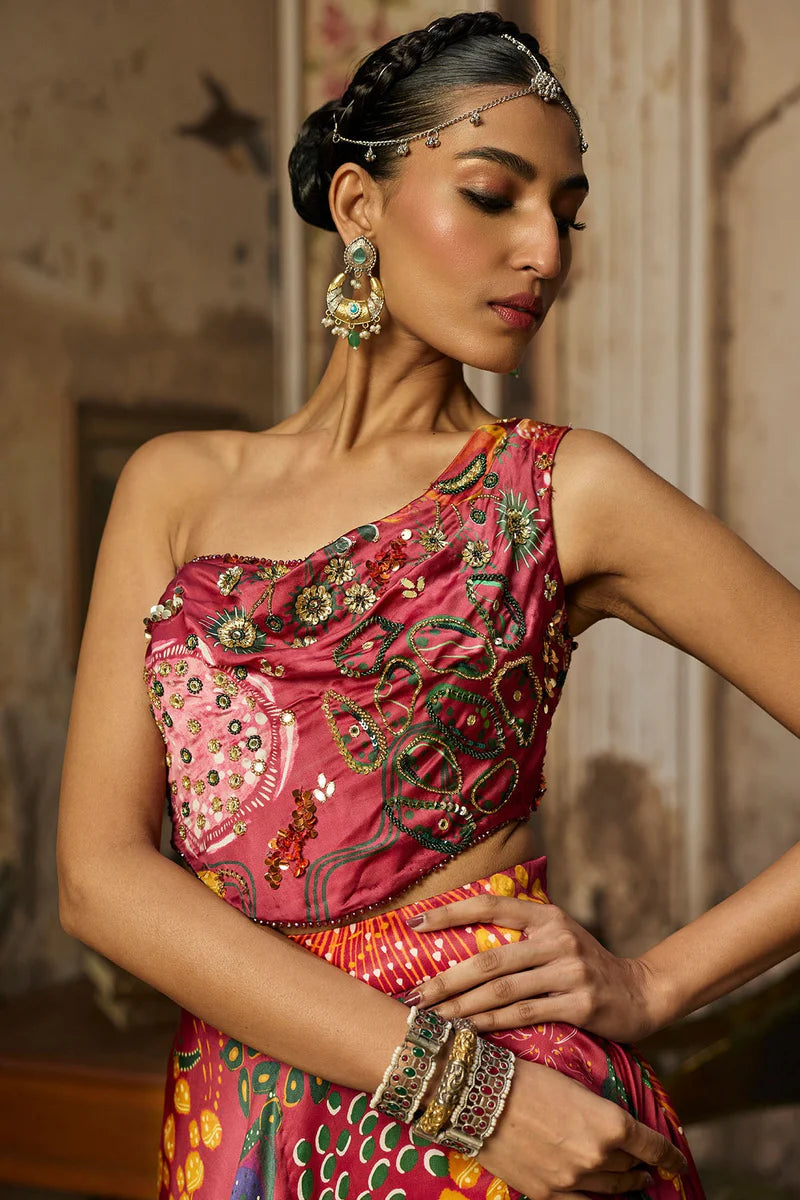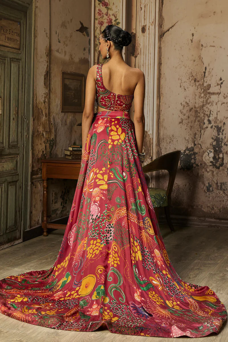 Deep Red Coral Veil Printed And Highlighted Cowl Detailed One Shoulder Corset With Deep Red Coral Veil printed Slit Skirt With Trai