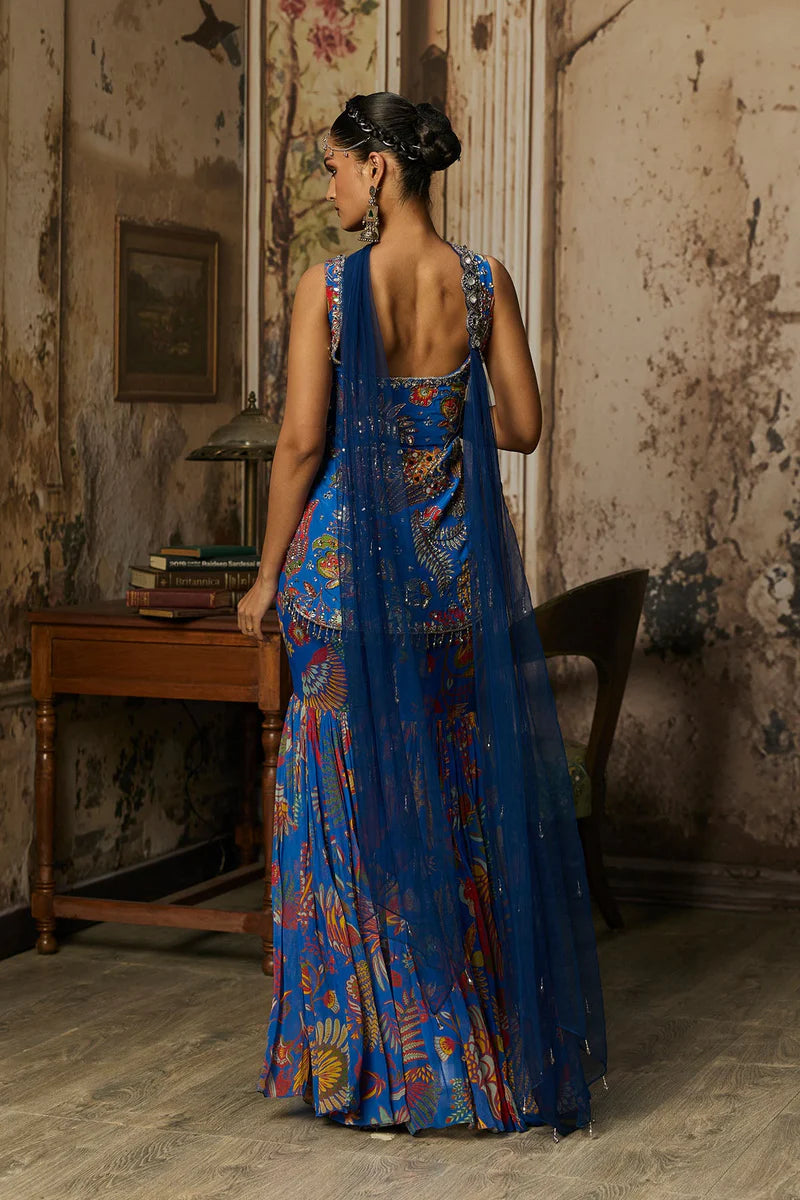 Electric Blue Featherfall Printed And Highlighted Kurti With Electric Blue Featherfall Printed Tired Gharara Paired With Choker Dupatta And Potli