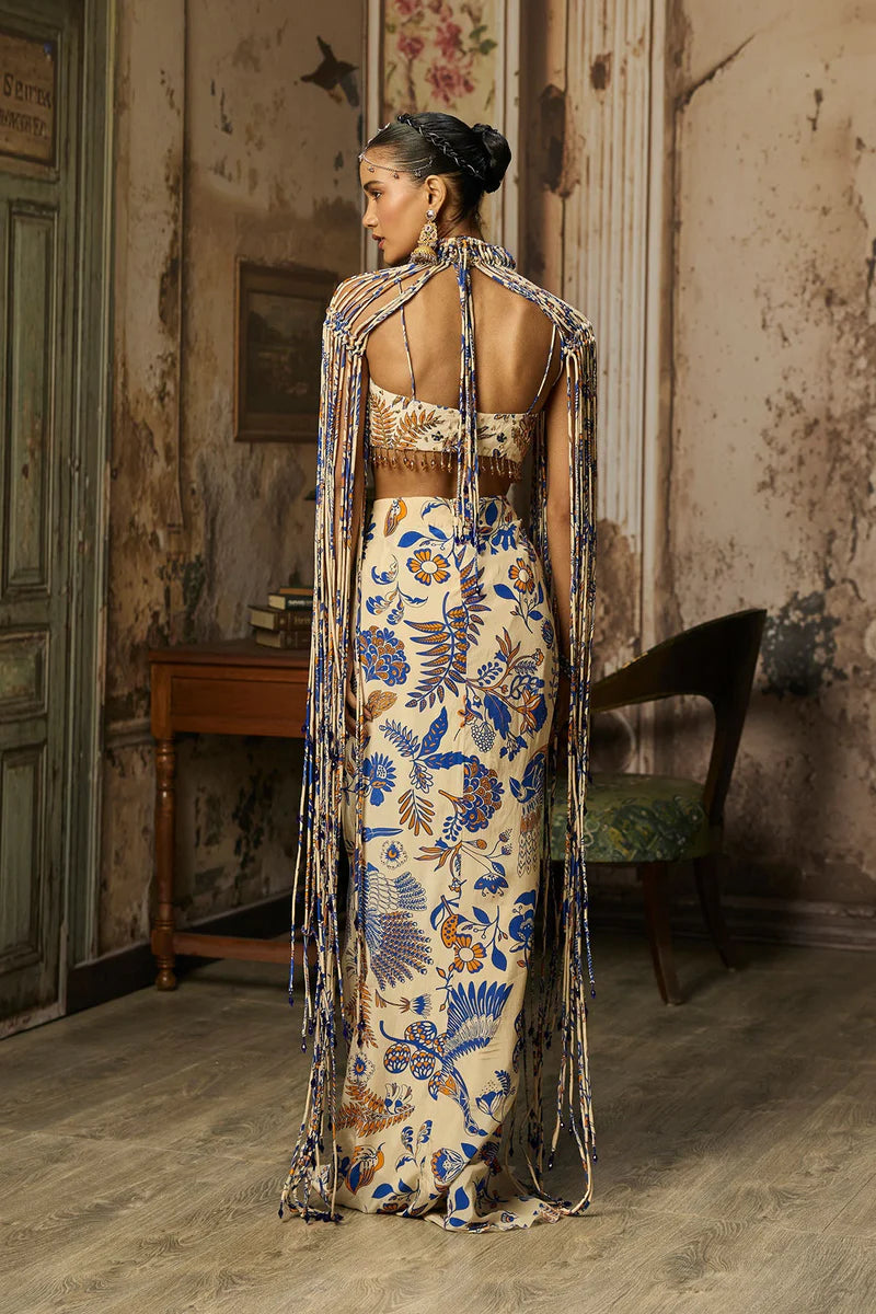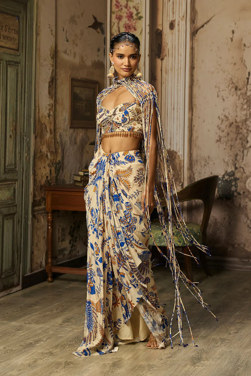 Ivory Featherfall Printed And Highlighted Blouse With Ivory Featherfall Printed Skirt Paired With Tassels Detailed Fringe Jacket