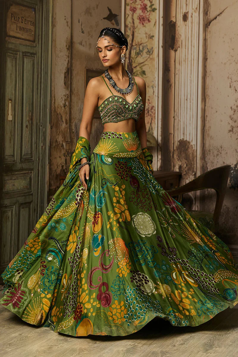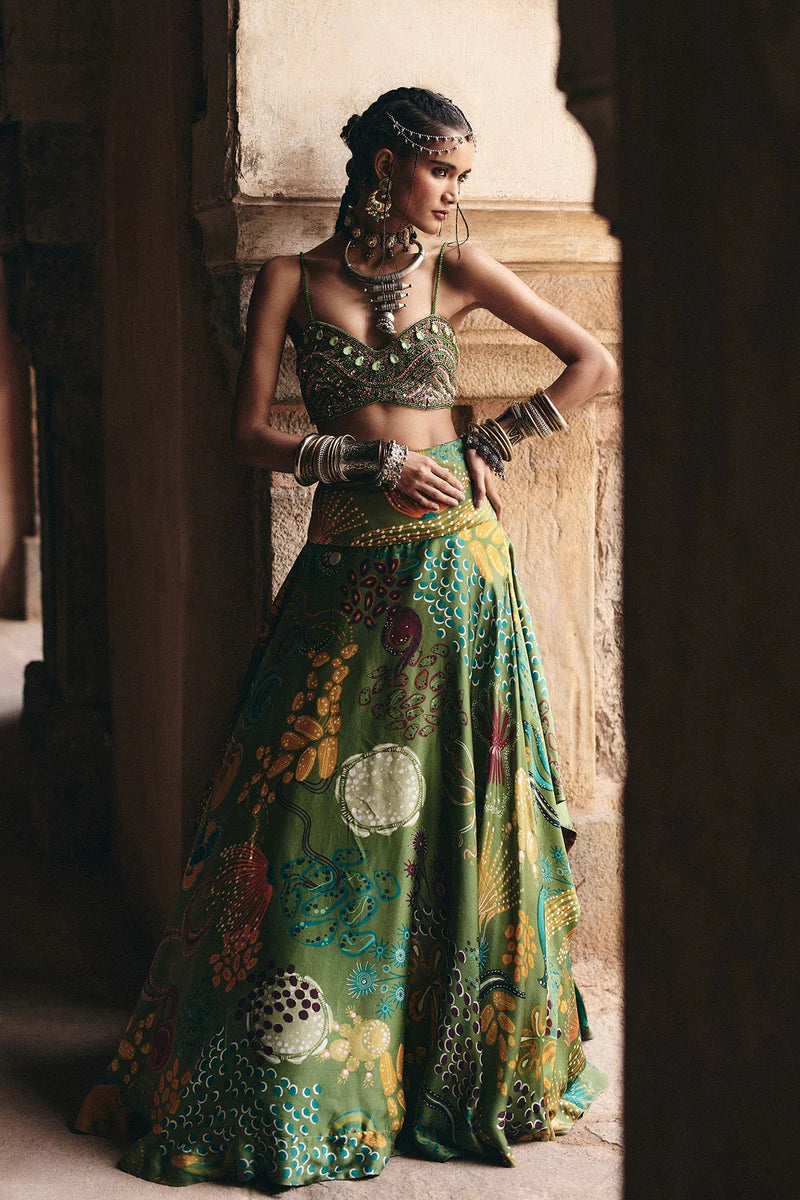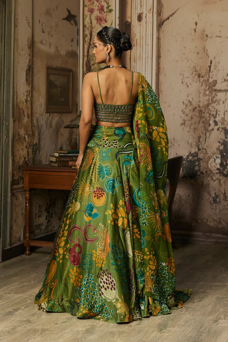 Pear Green Coral Veil Embellished Blouse With Pear Green Coral Veil Printed High-Waisted Cowl Skirt Paired With Tassels Detailed Printed Dupatta