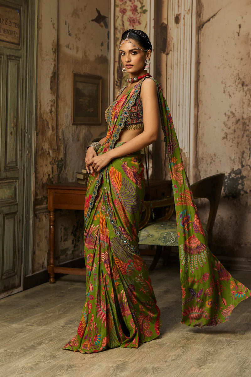 Pear Green Featherfall Printed And Highlighted Blouse With Pear Green Featherfall Printed And Embroidered Border Dhoti Skirt Saree