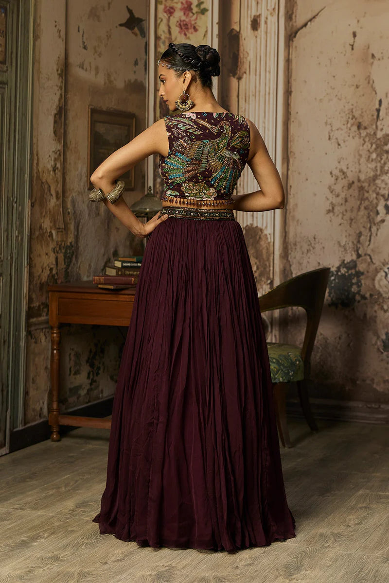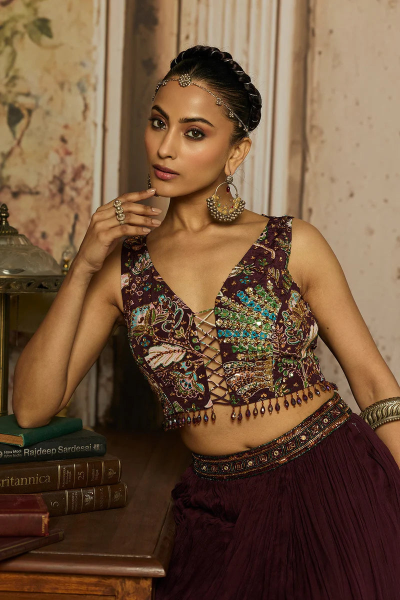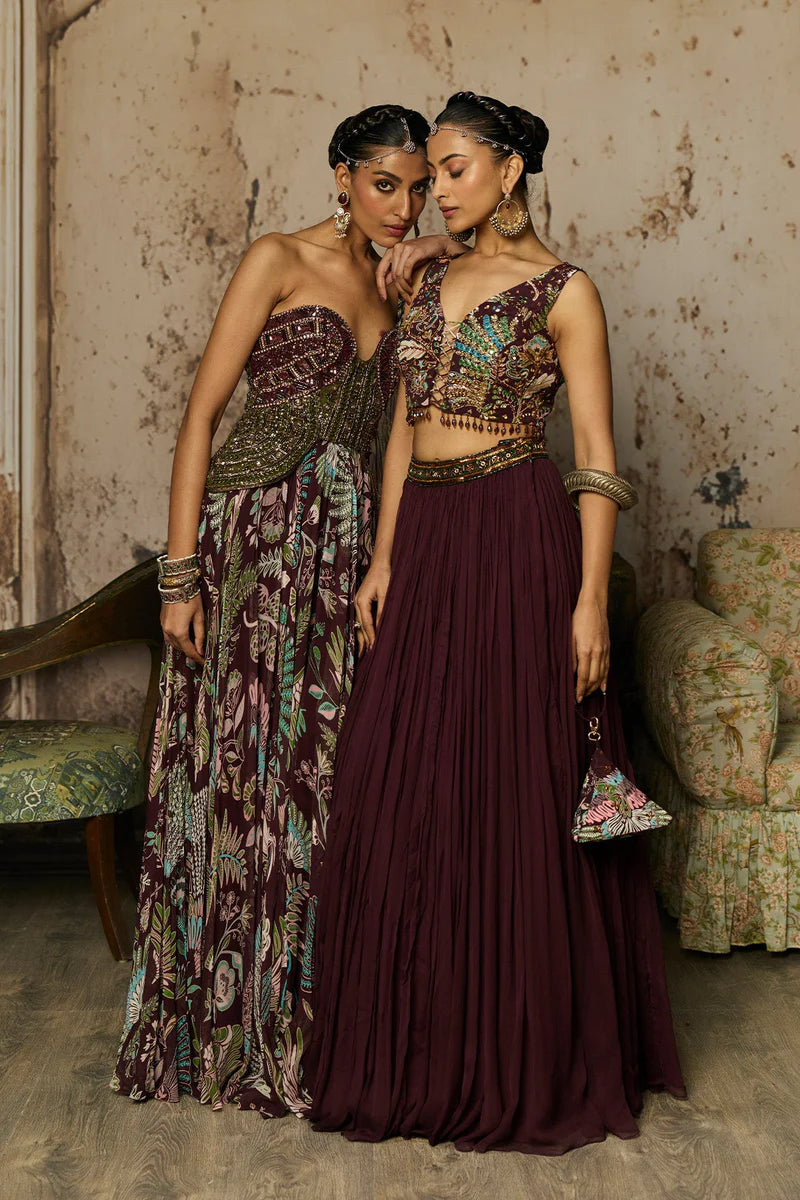 Plum Featherfall Printed And Highlighted Crop Top With Solid Plum Gathered Skirt Paired With Potli