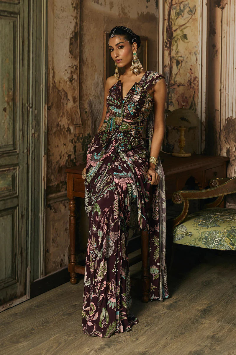 Plum Featherfall Printed And Highlighted Overlap Corset With Plum Featherfall Printed Dhoti Skirt Saree