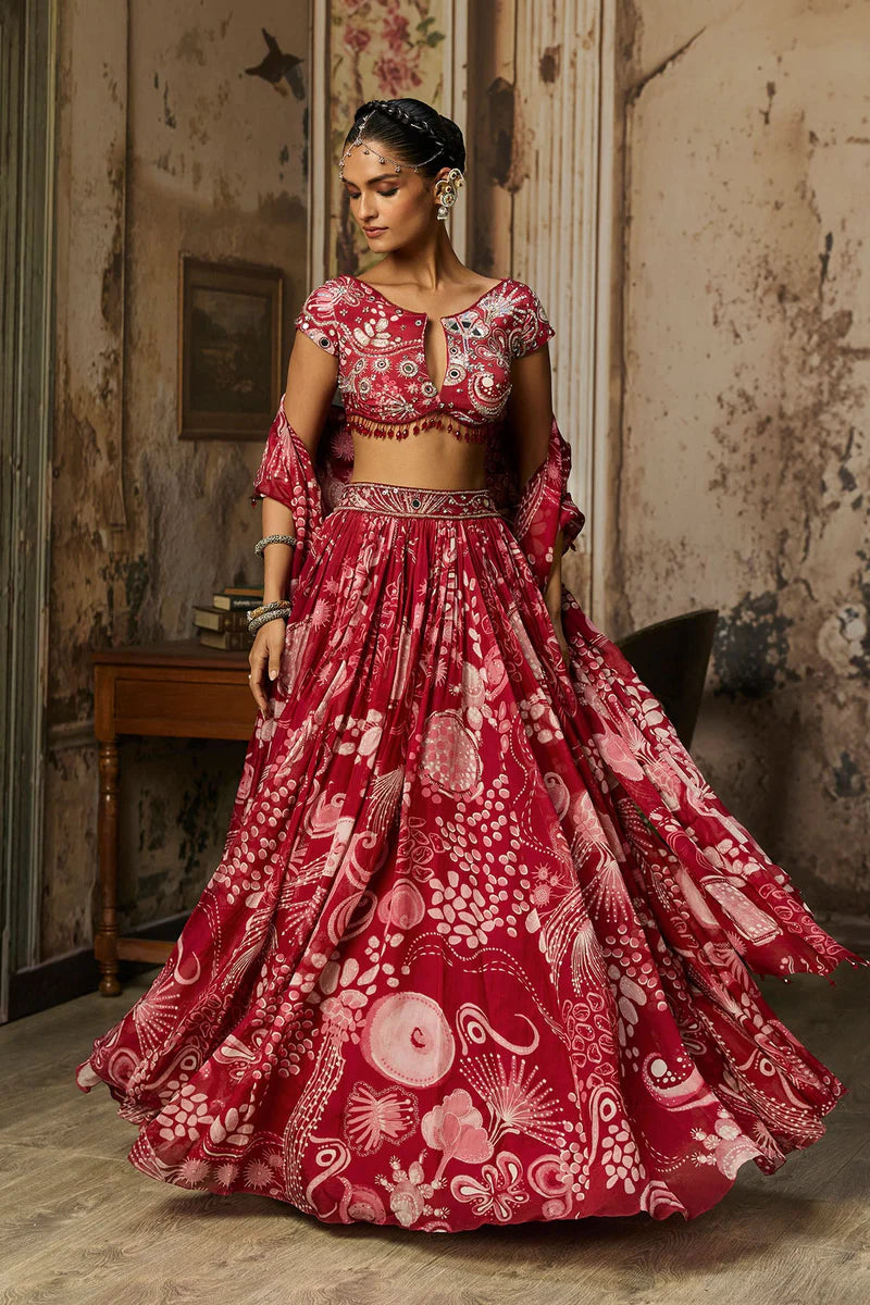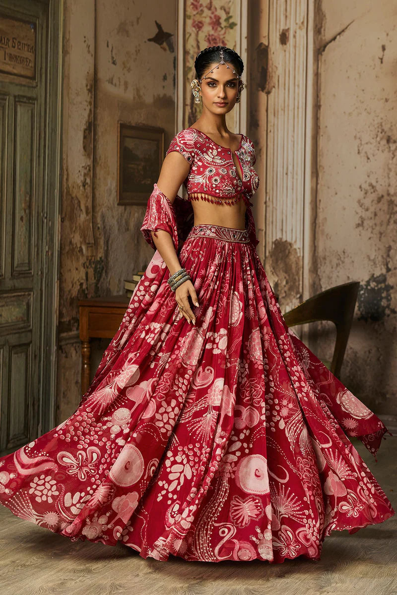 Scarlet Red Coral Veil Printed And Highlighted Blouse With Scarlet Red Coral Veil Printed Lehenga With Highlighted Dupatta