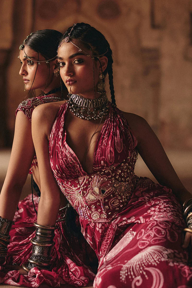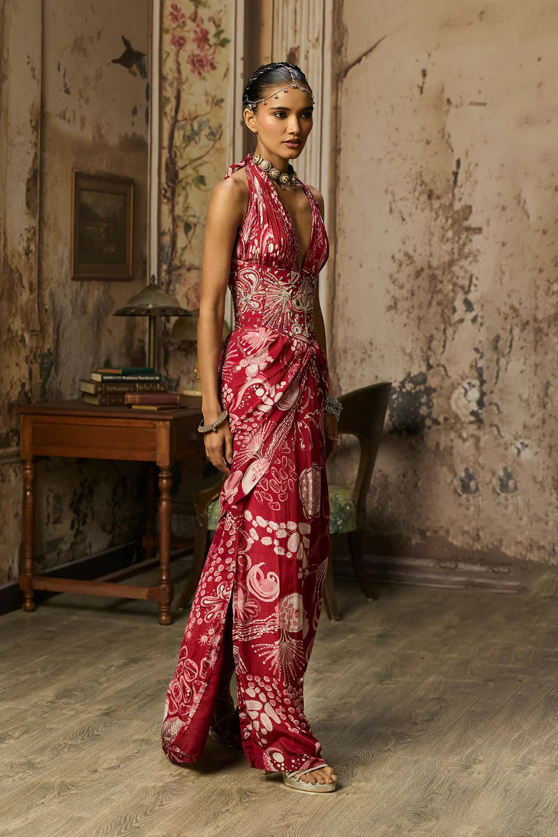 Scarlet Red Printed Slit Dress With Highlighted Corset Belt