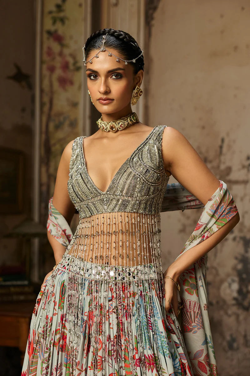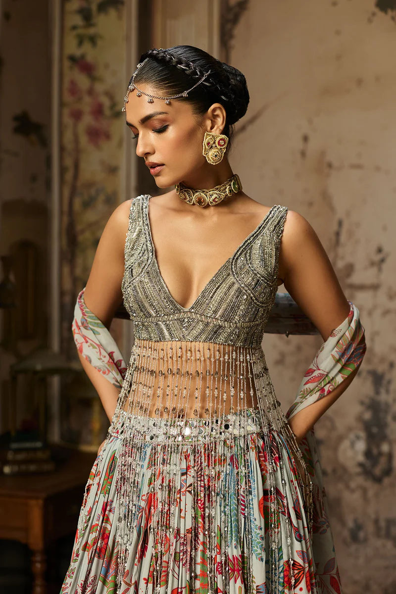 Slate Grey Embroidered Blouse Detailed With Dangling Tassels Paired With Slate Grey Featherfall Printed Lehenga & Dupatta