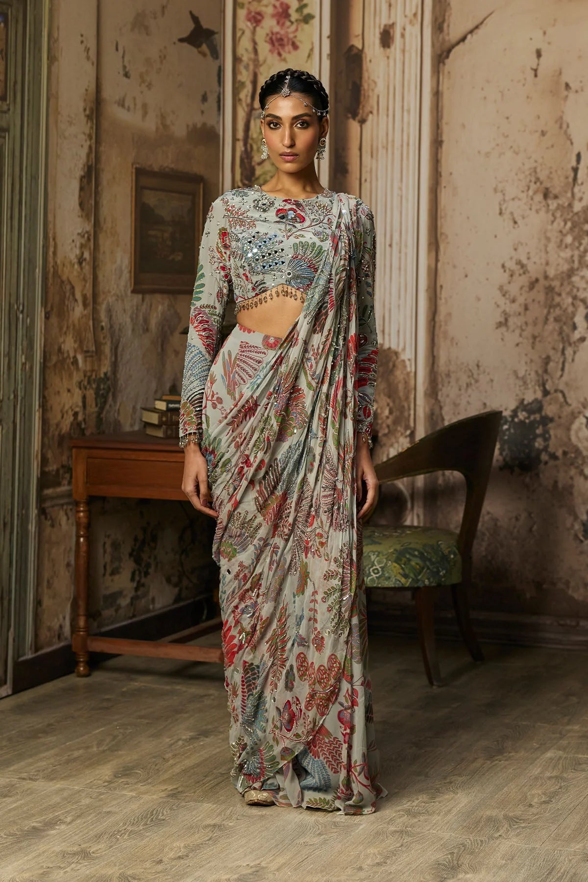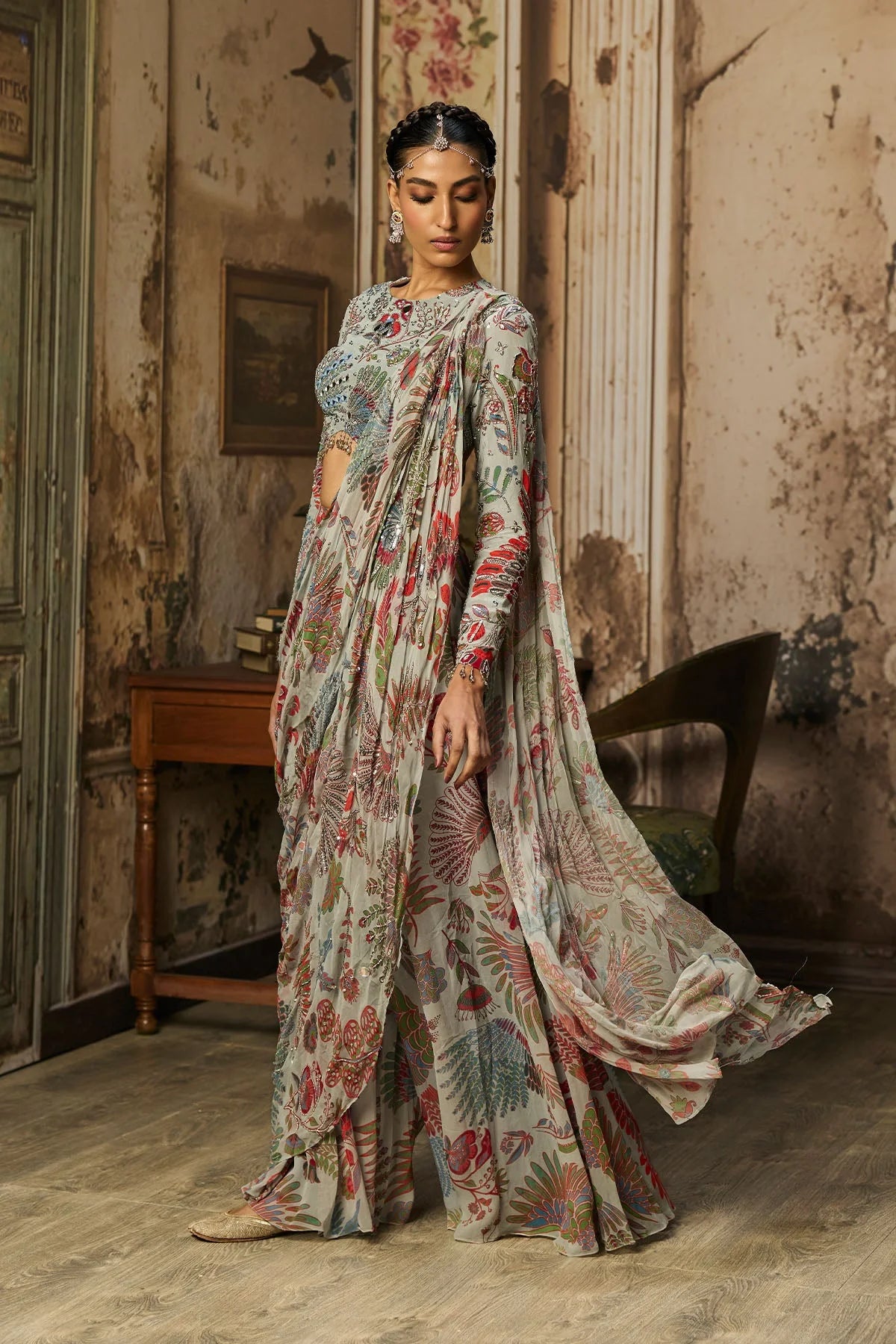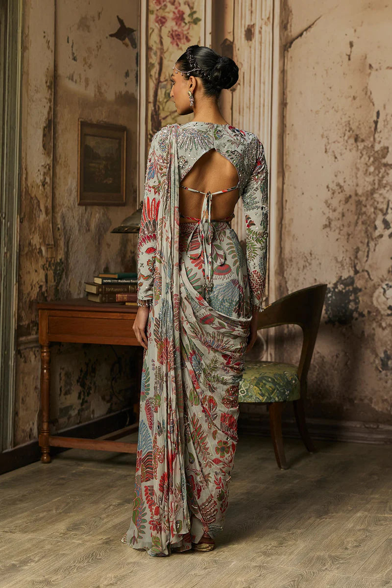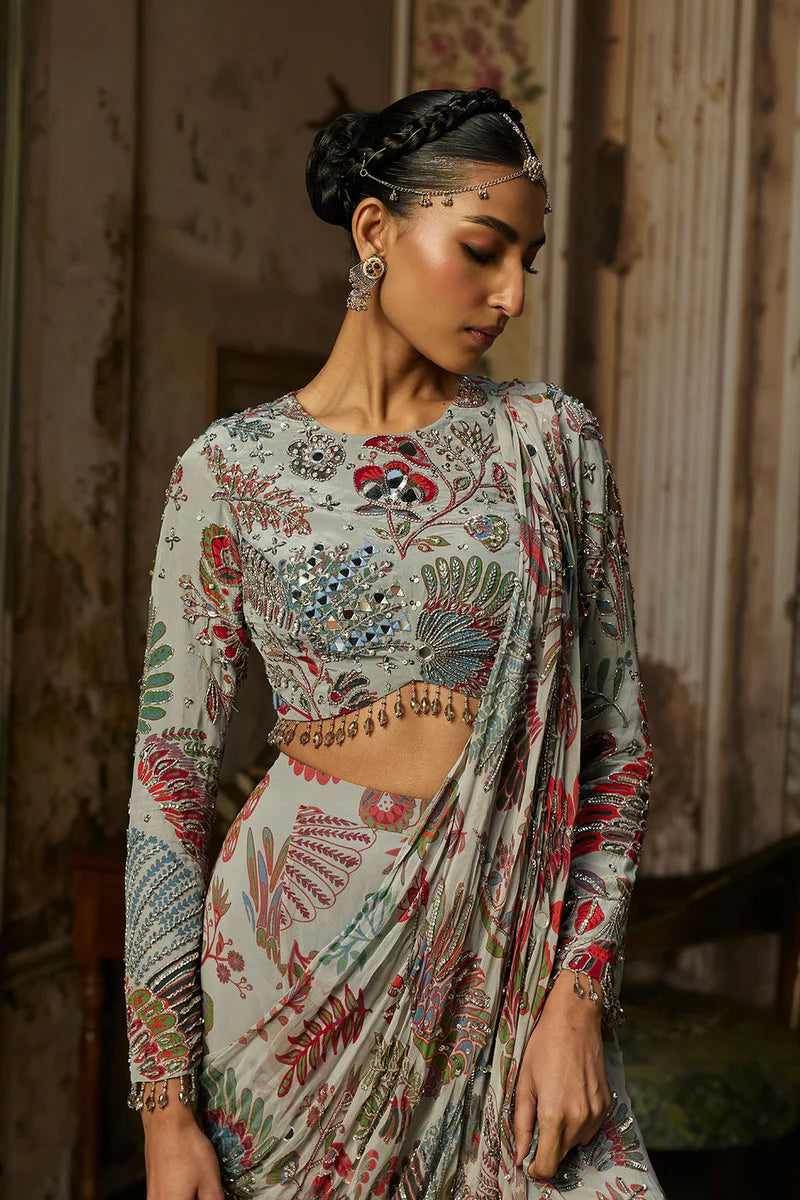 Slate Grey Featherfall Printed And Highlighted Blouse With Slate Grey Featherfall Printed And Highlighted Drape Sharara Pants Saree