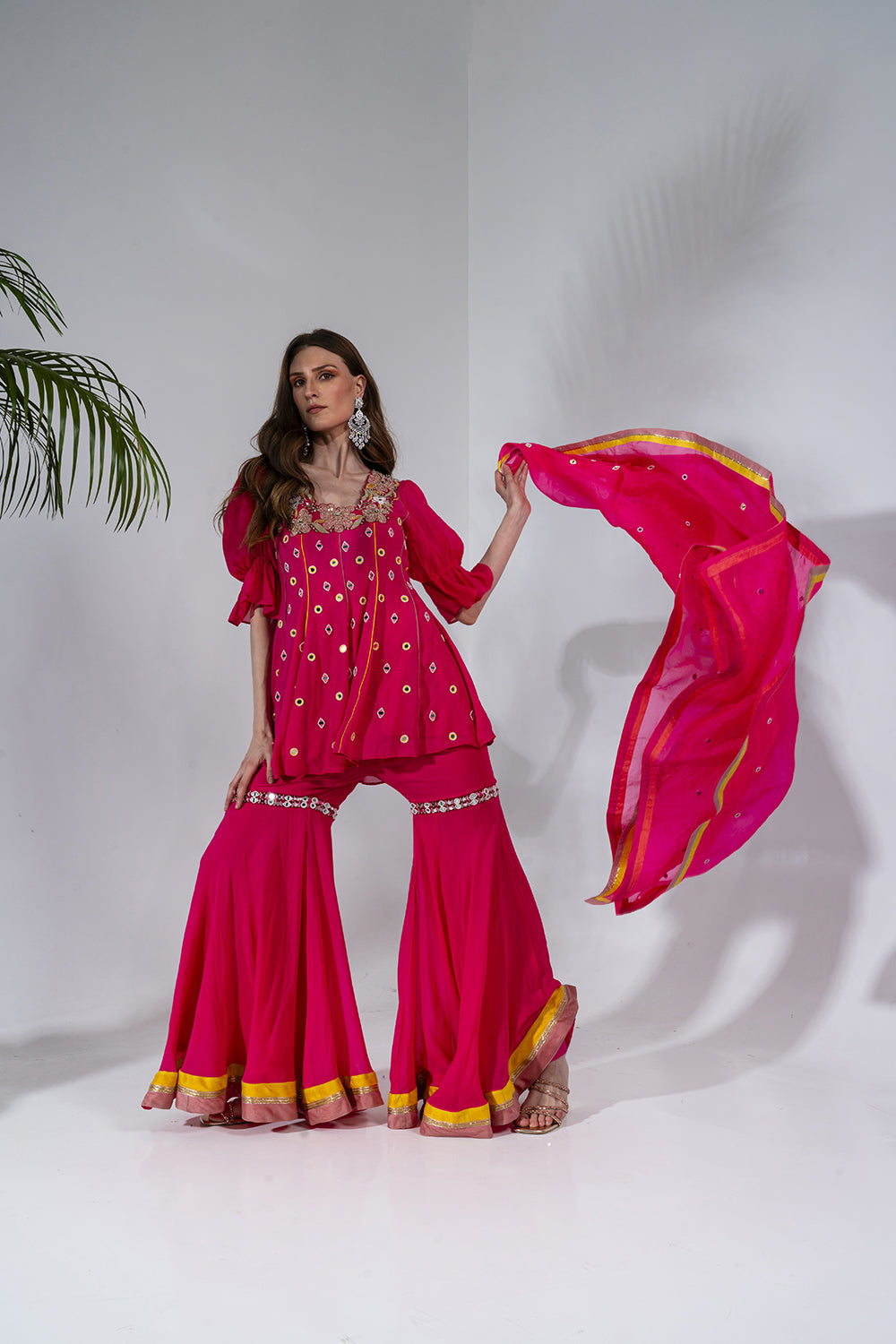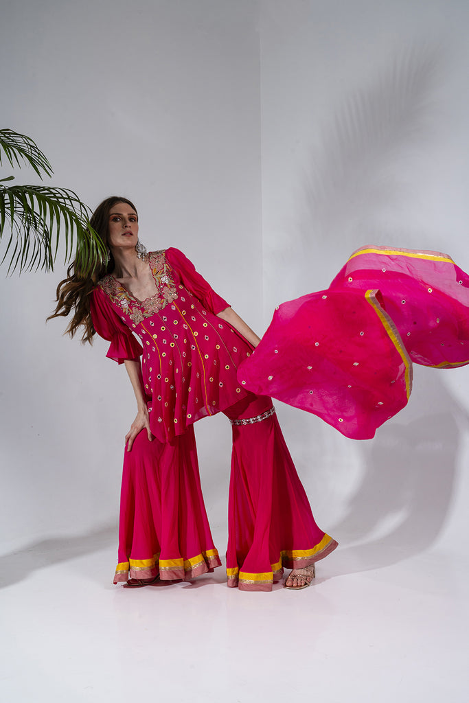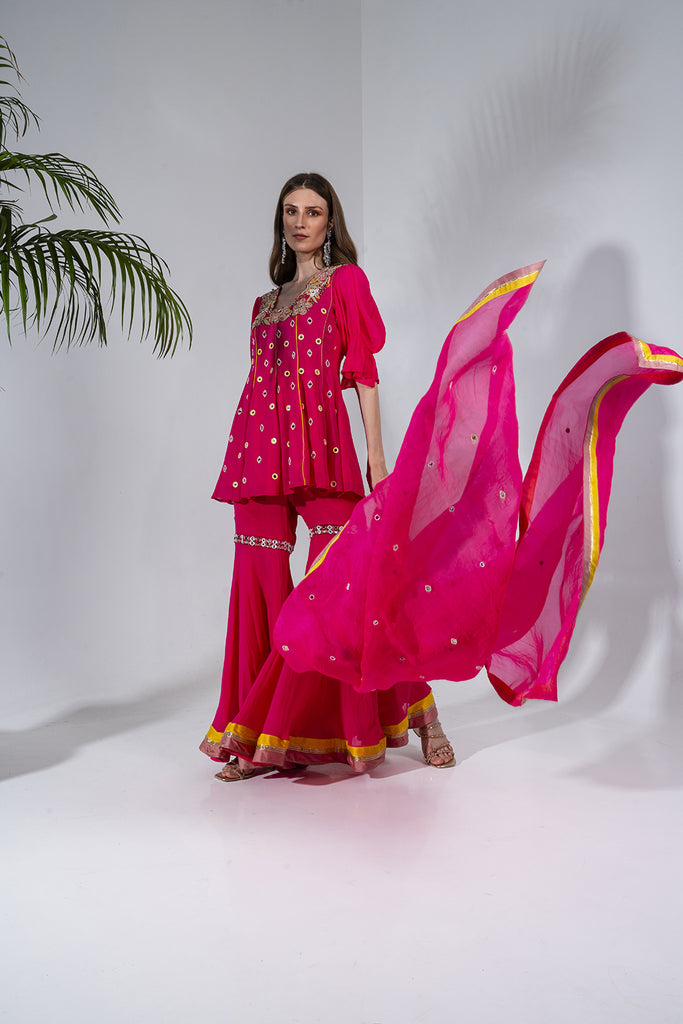 Fuscia  Georgette Garara Set With Organza Dupatta