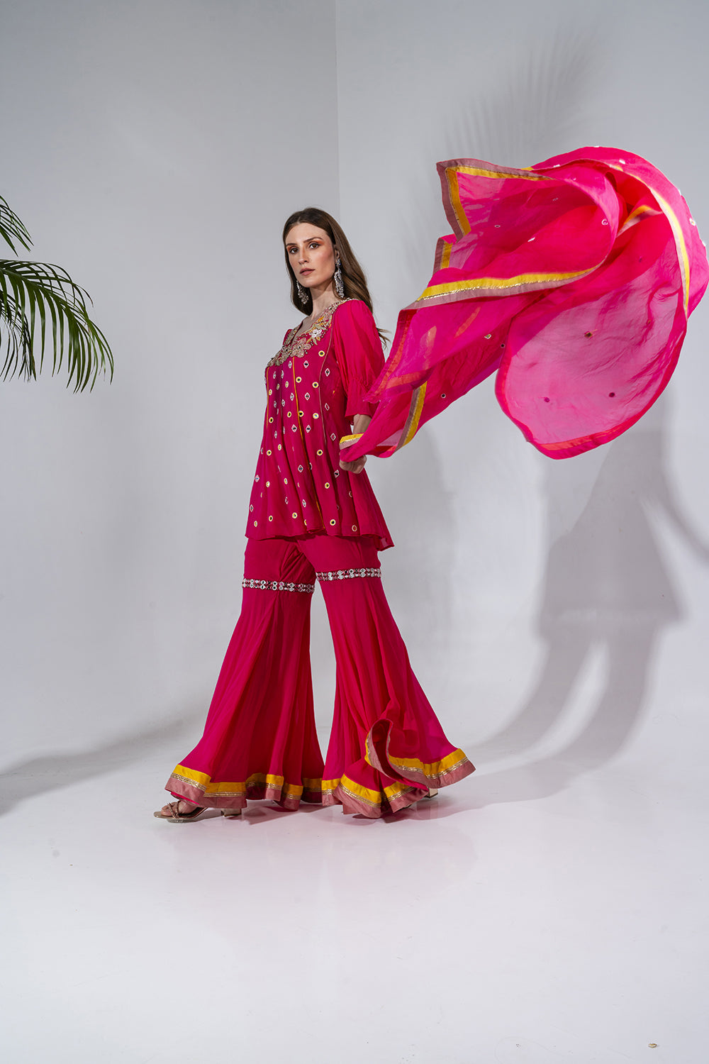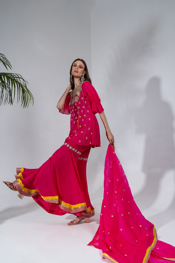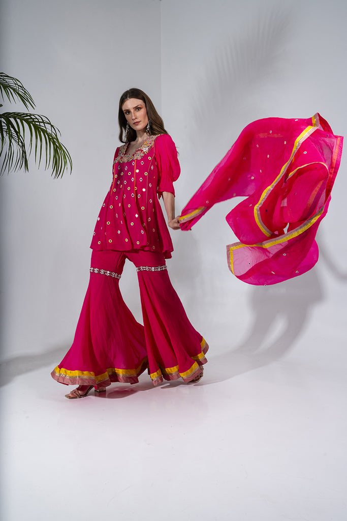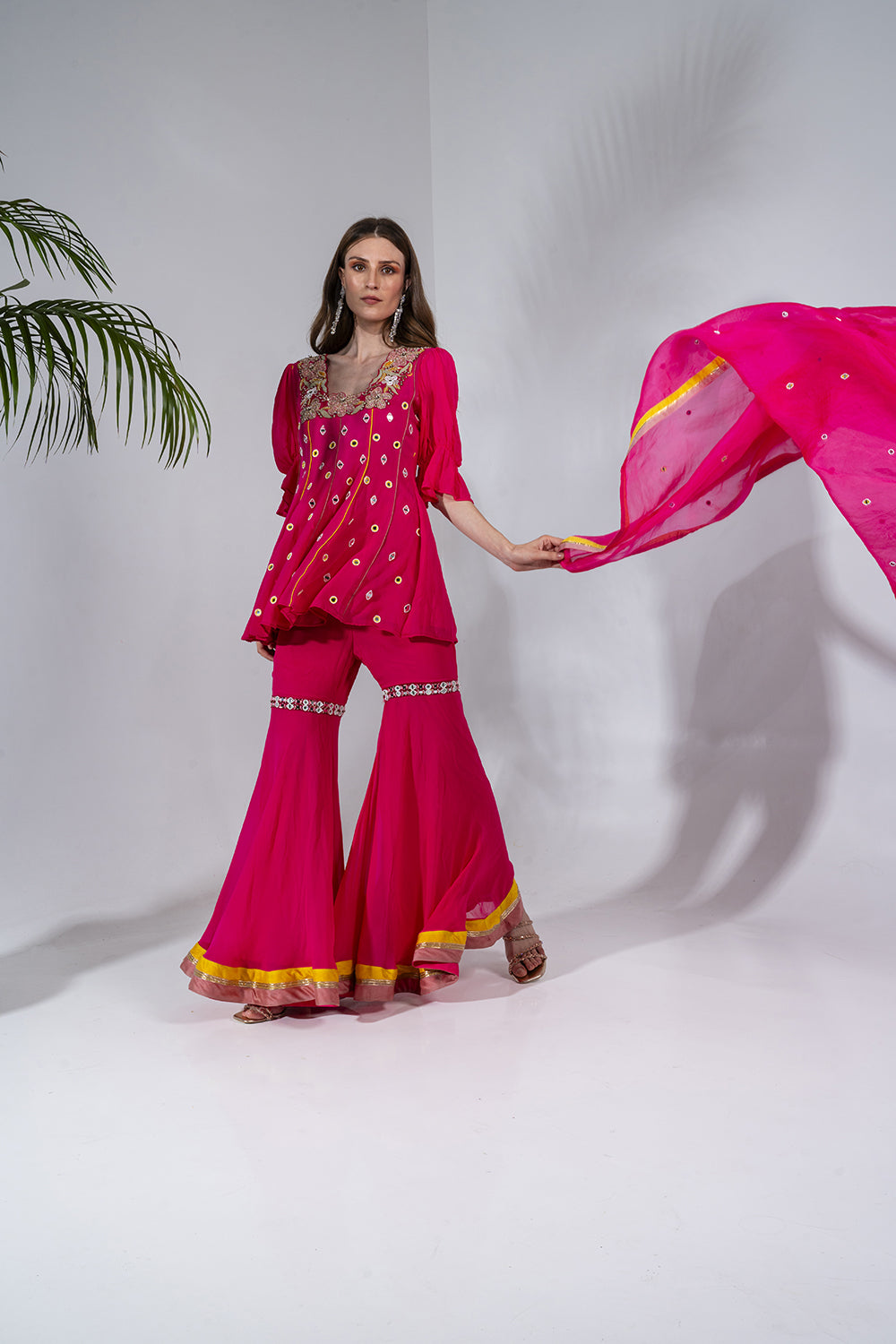 Fuscia  Georgette Garara Set With Organza Dupatta