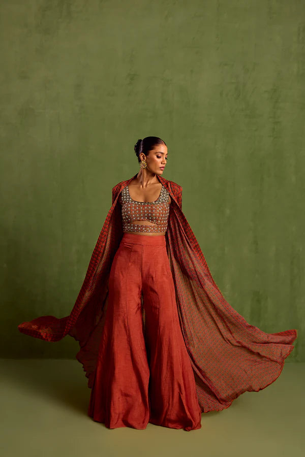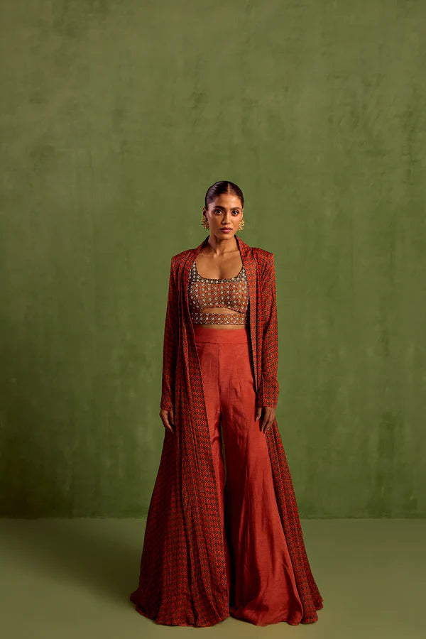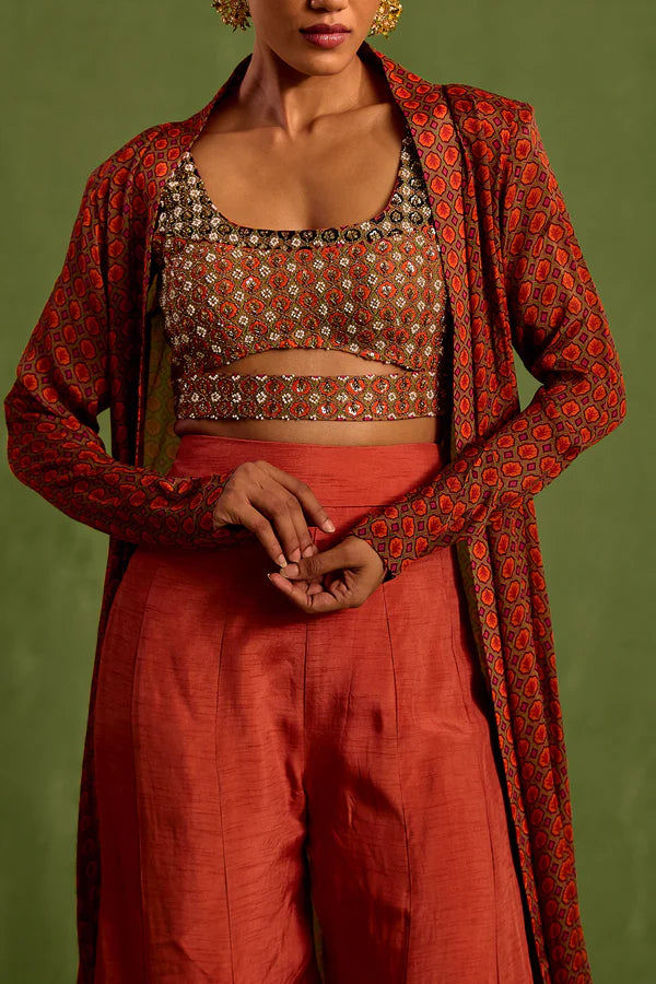 Orange floor length jacket with all over floral butti prints. Paired with a padded blouse with belt cut-out and all over hand embroidery using beads, zari, sequin work and sharara.