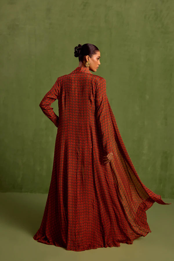Orange Viscose Chinon Print Floral Butti Blouse Scoop Neck Jacket Sharara Set