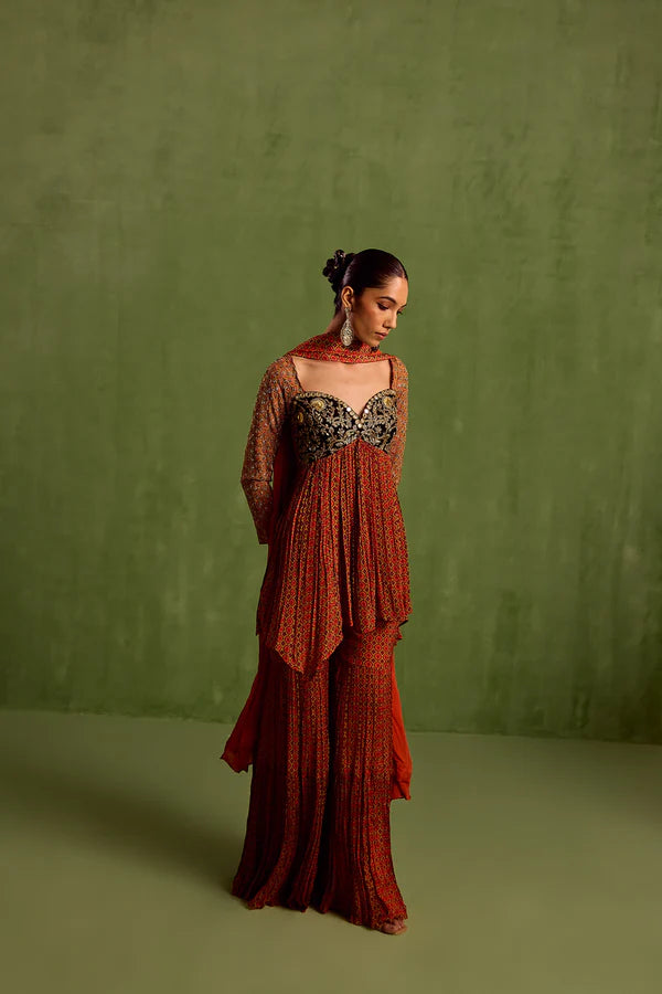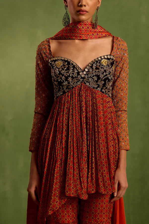Orange asymmetric, pleated kurta with butti prints, hand embroidered yoke in floral pattern. Paired with a gharara with butti prints and dupatta.