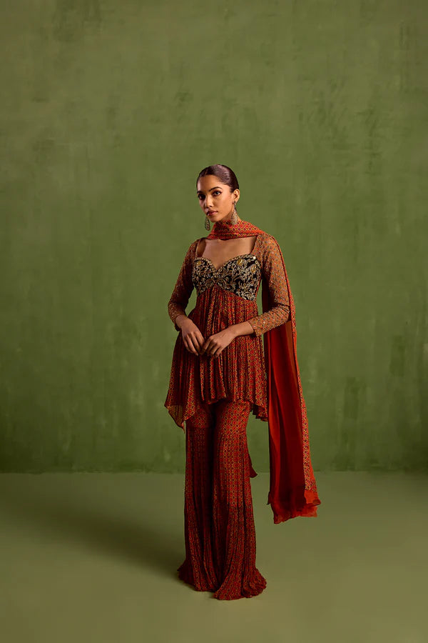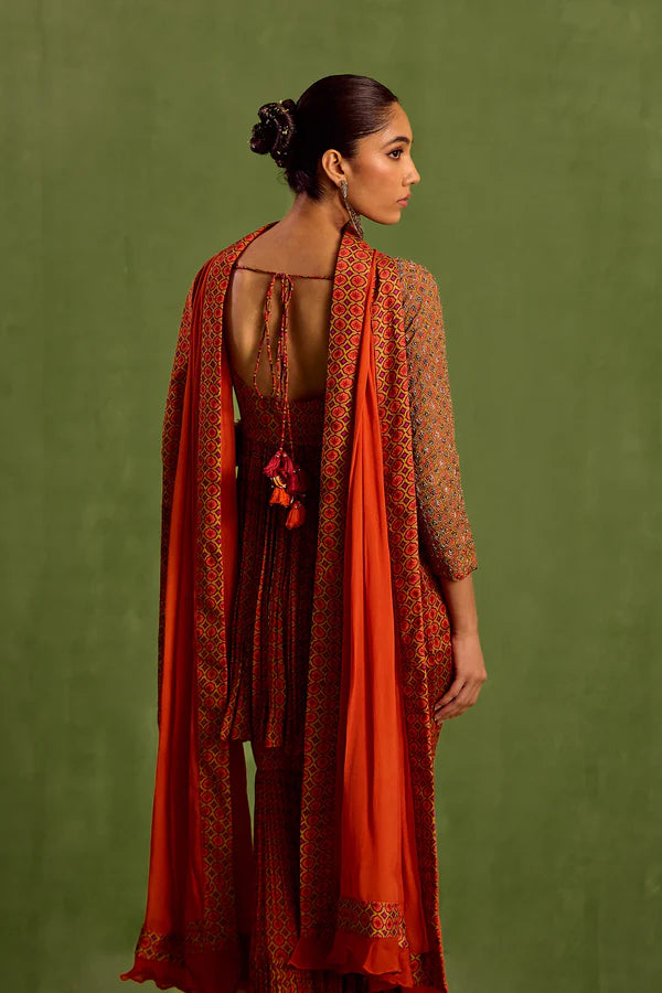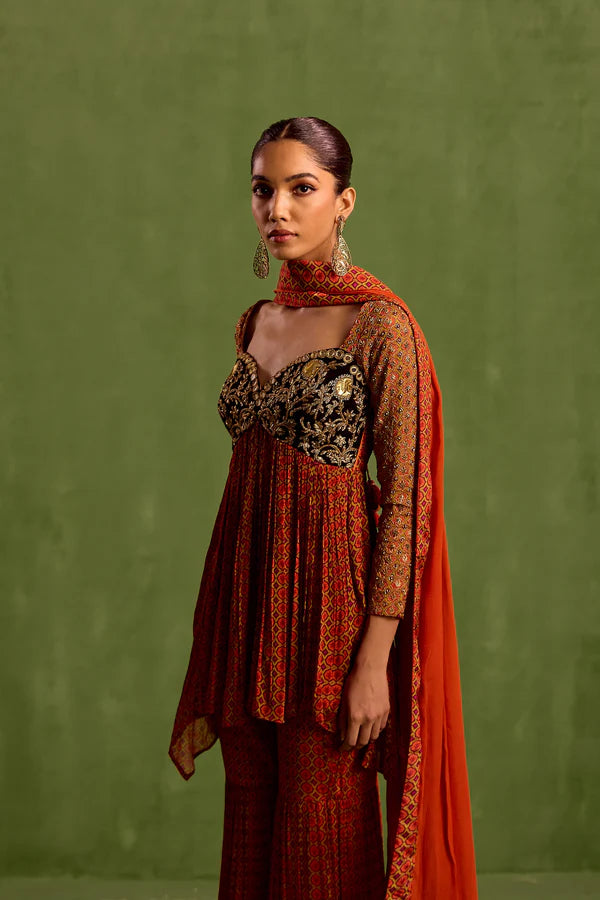 Orange Viscose Chinon Print Hand Embroidered Yoke Asymmetric Kurta Gharara Set