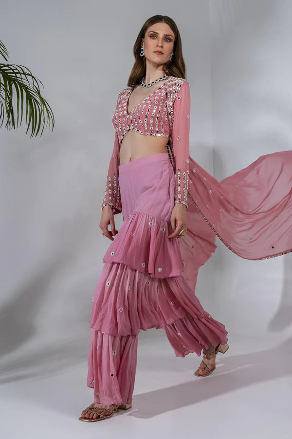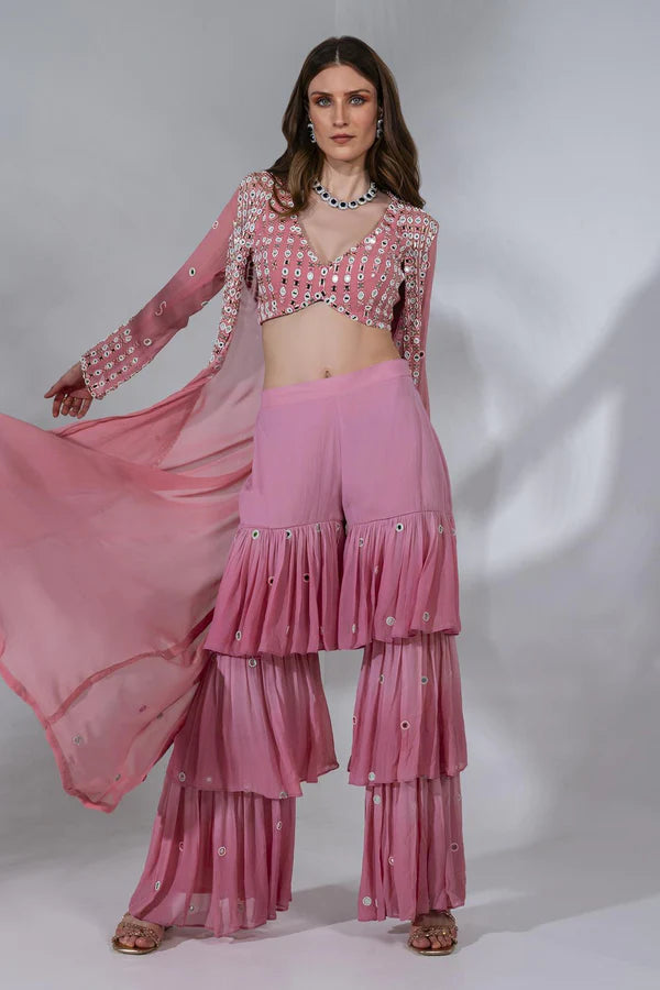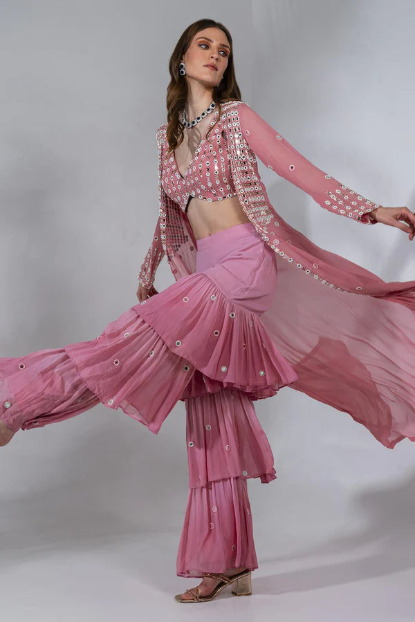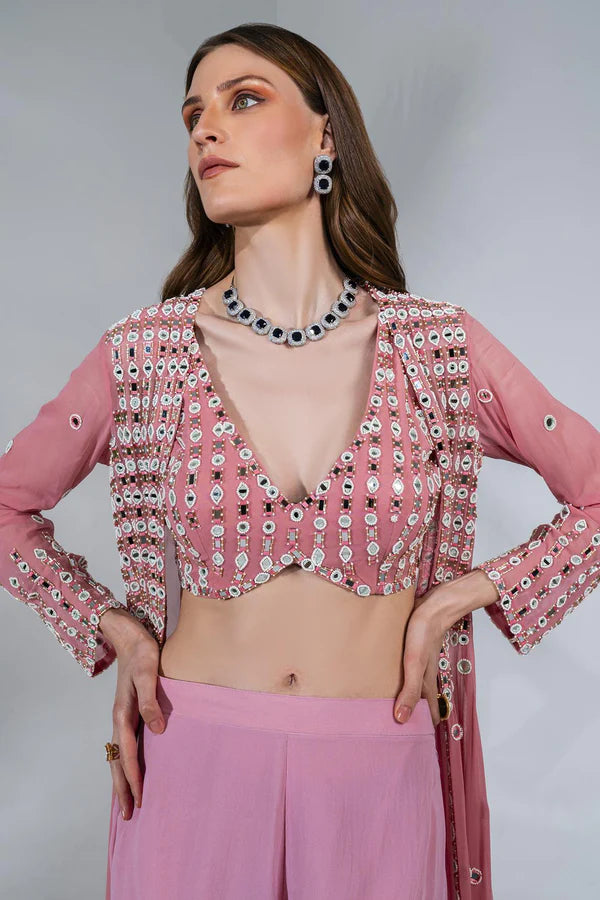 Pink mirror embellished blouse with a V neck and long sleeeves. Paired with an embroidered longline jacket and gharara.