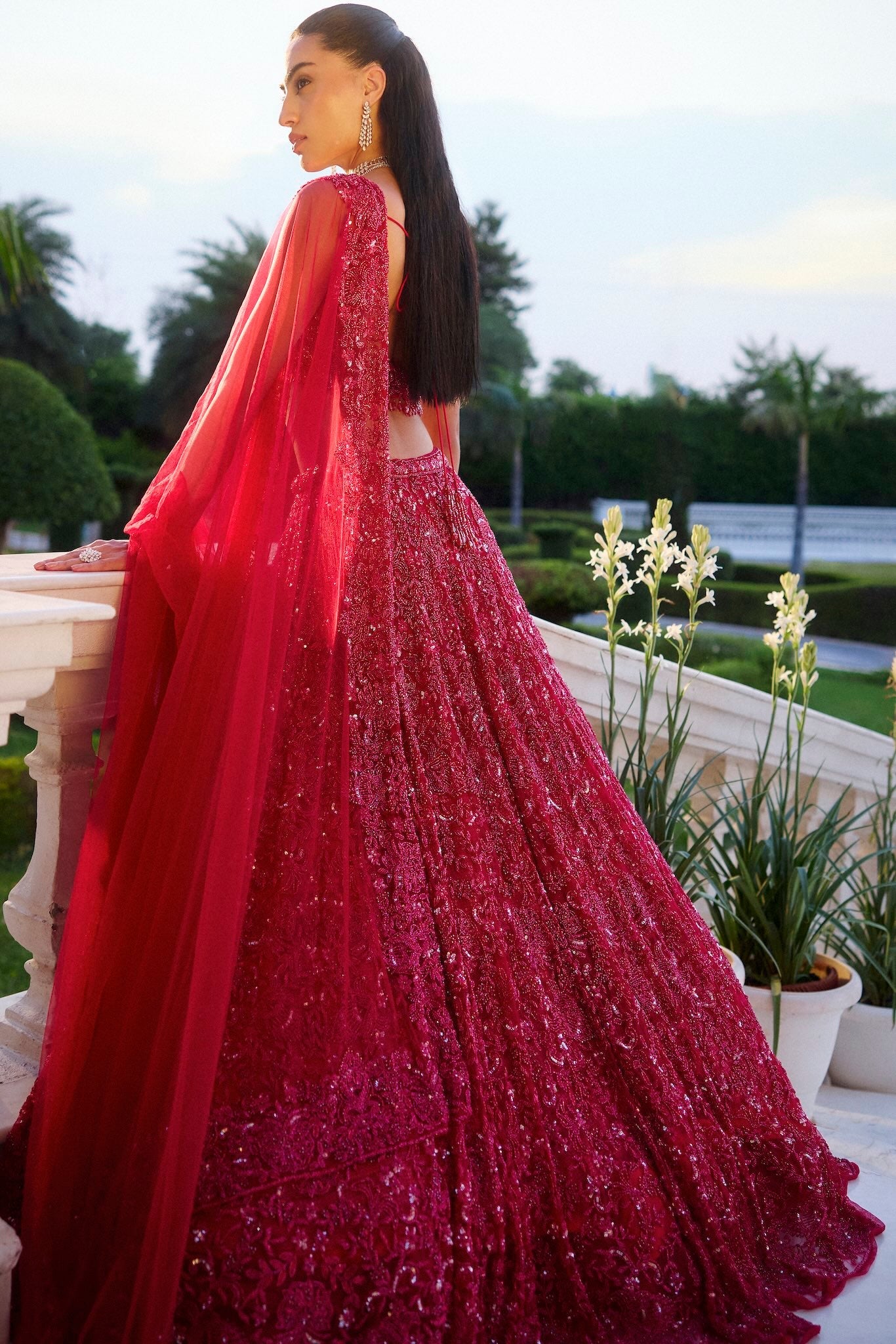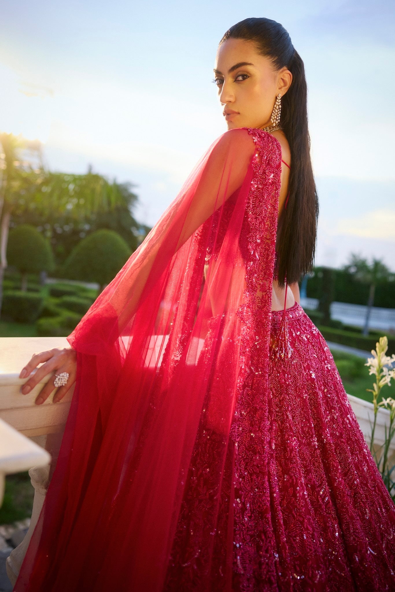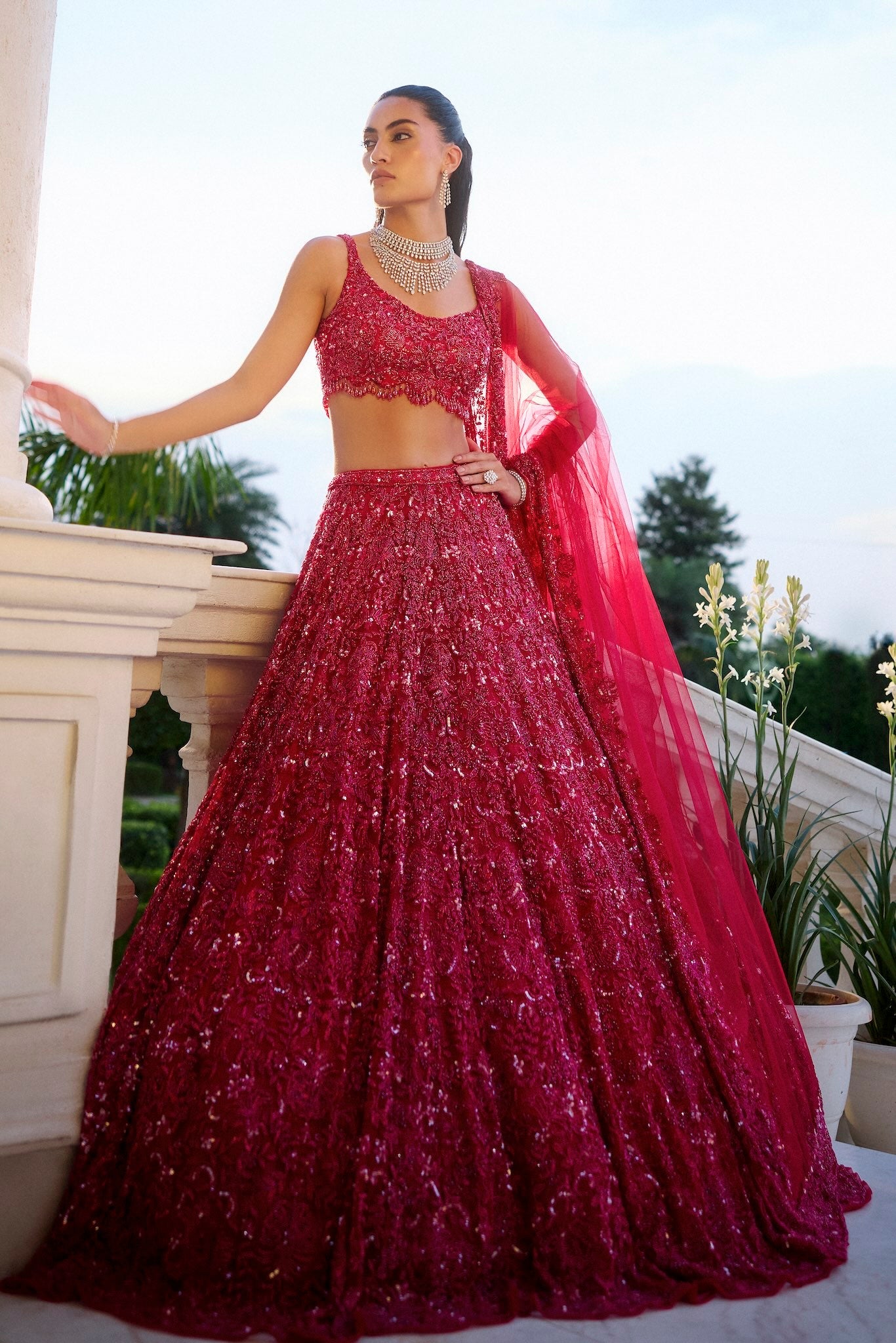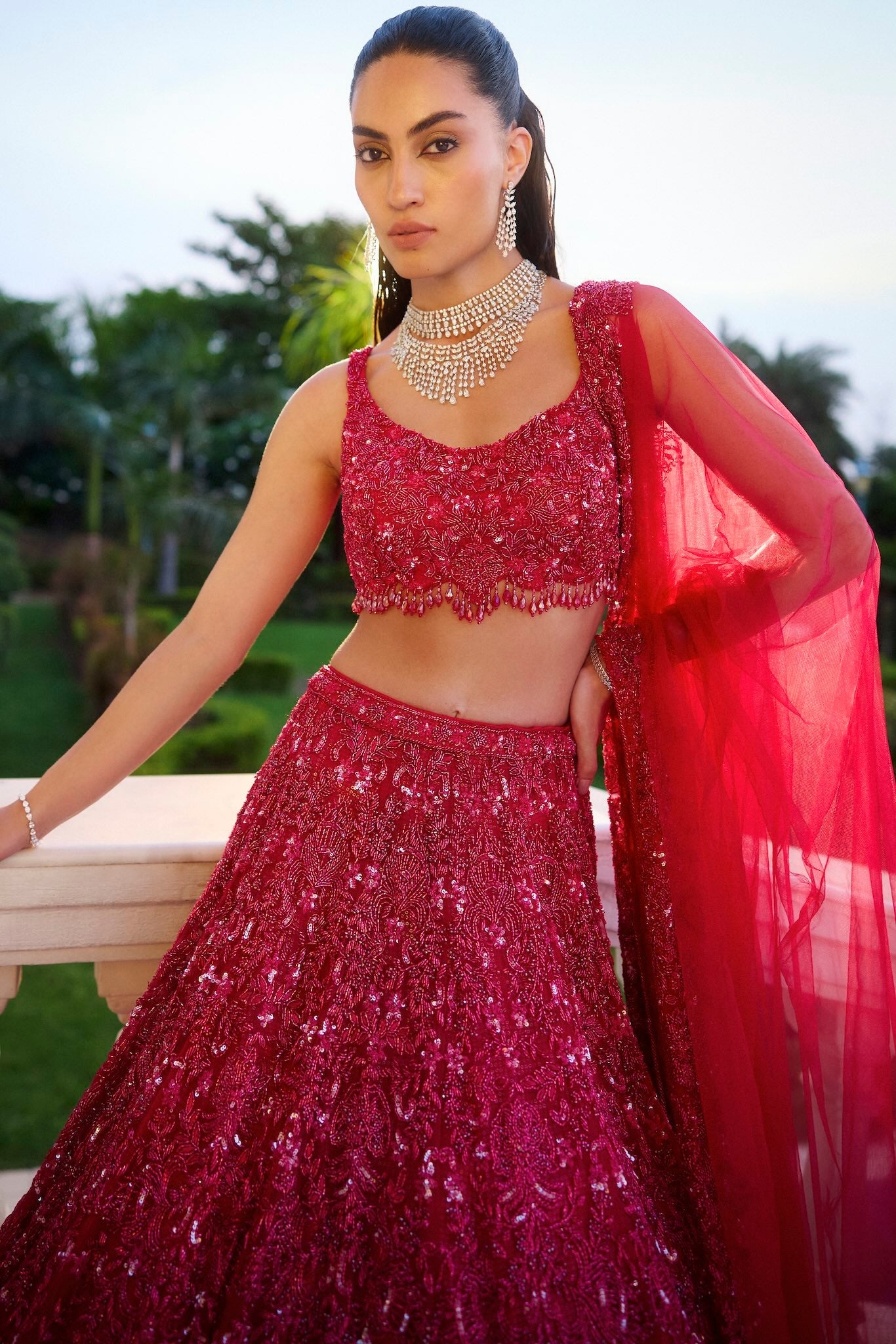Featuring a crimson red pink lehenga, meticulously hand-embroidered on tulle fabric with crystals, cutdana, sequin, beads detailing. The blouse shows crystal tassels at the waist. Paired with a cutdana and crystal detailed matching dupatta with embroidery on all four sides.