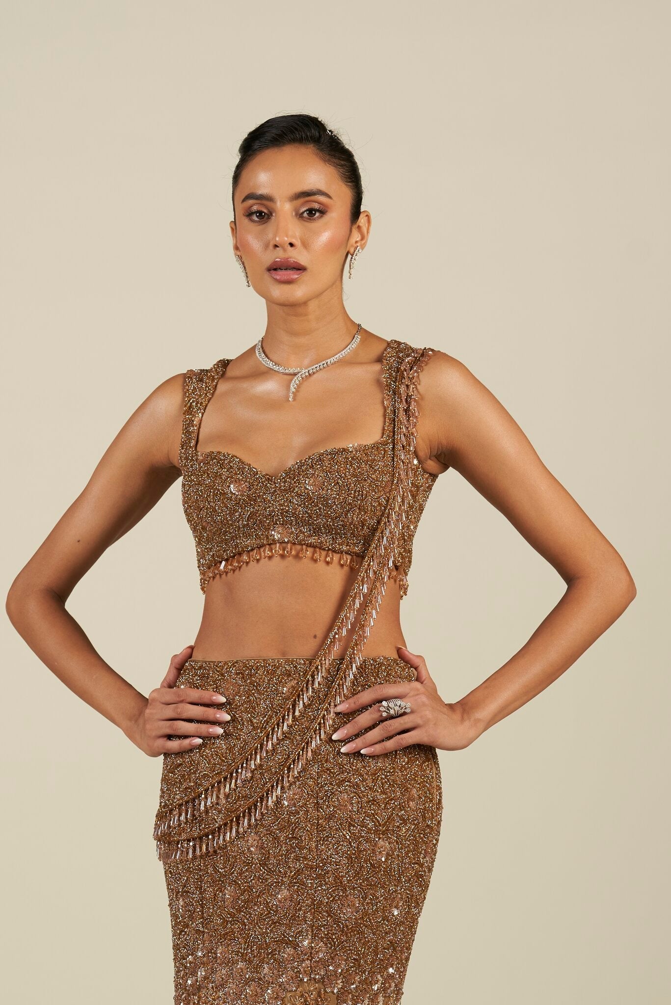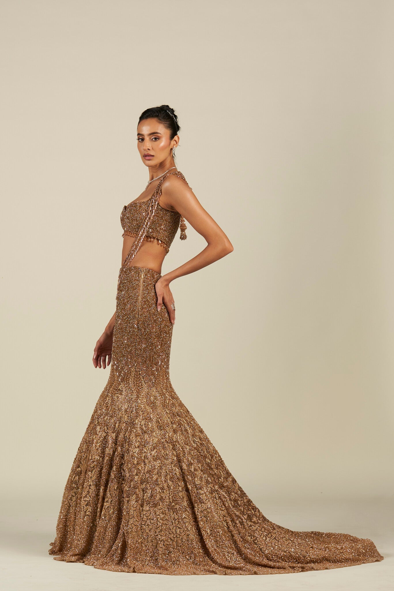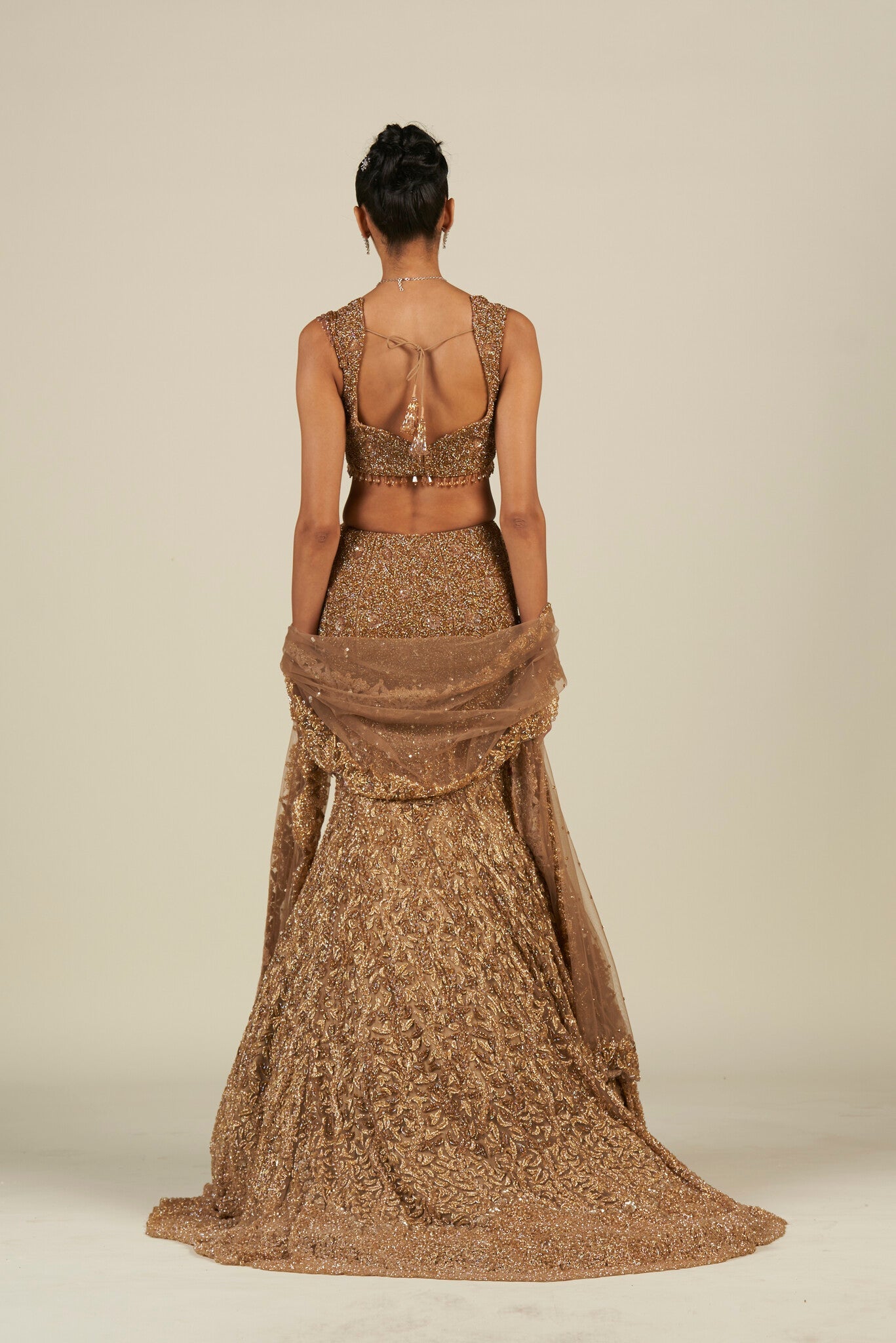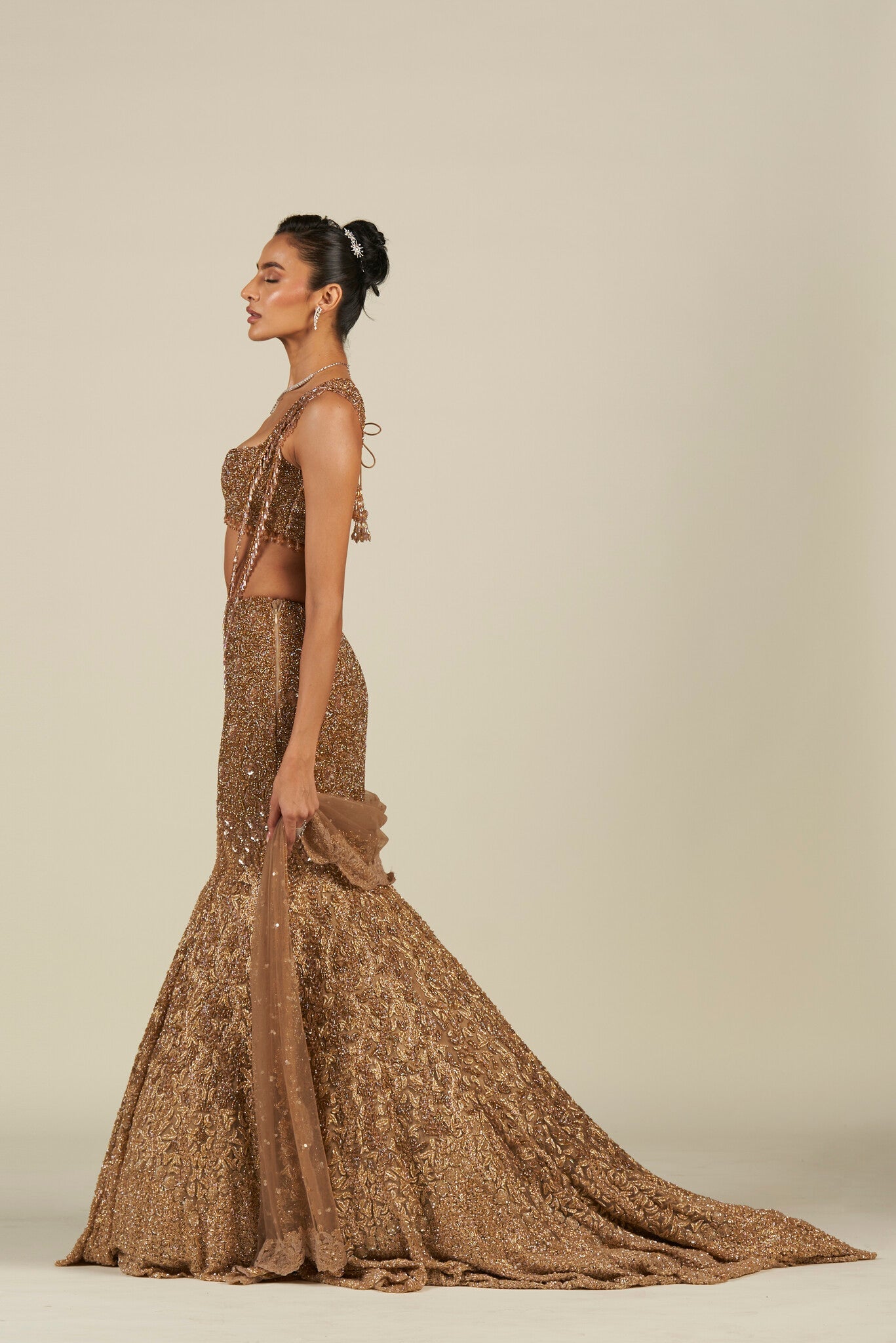 Featuring an ombre brown gold fish cut lehenga, meticulously hand-embroidered on tulle fabric with cutdana ,beads and sequin detailing. Paired with a cutdana and sequin detailed matching dupatta with embroidery on all four sides.