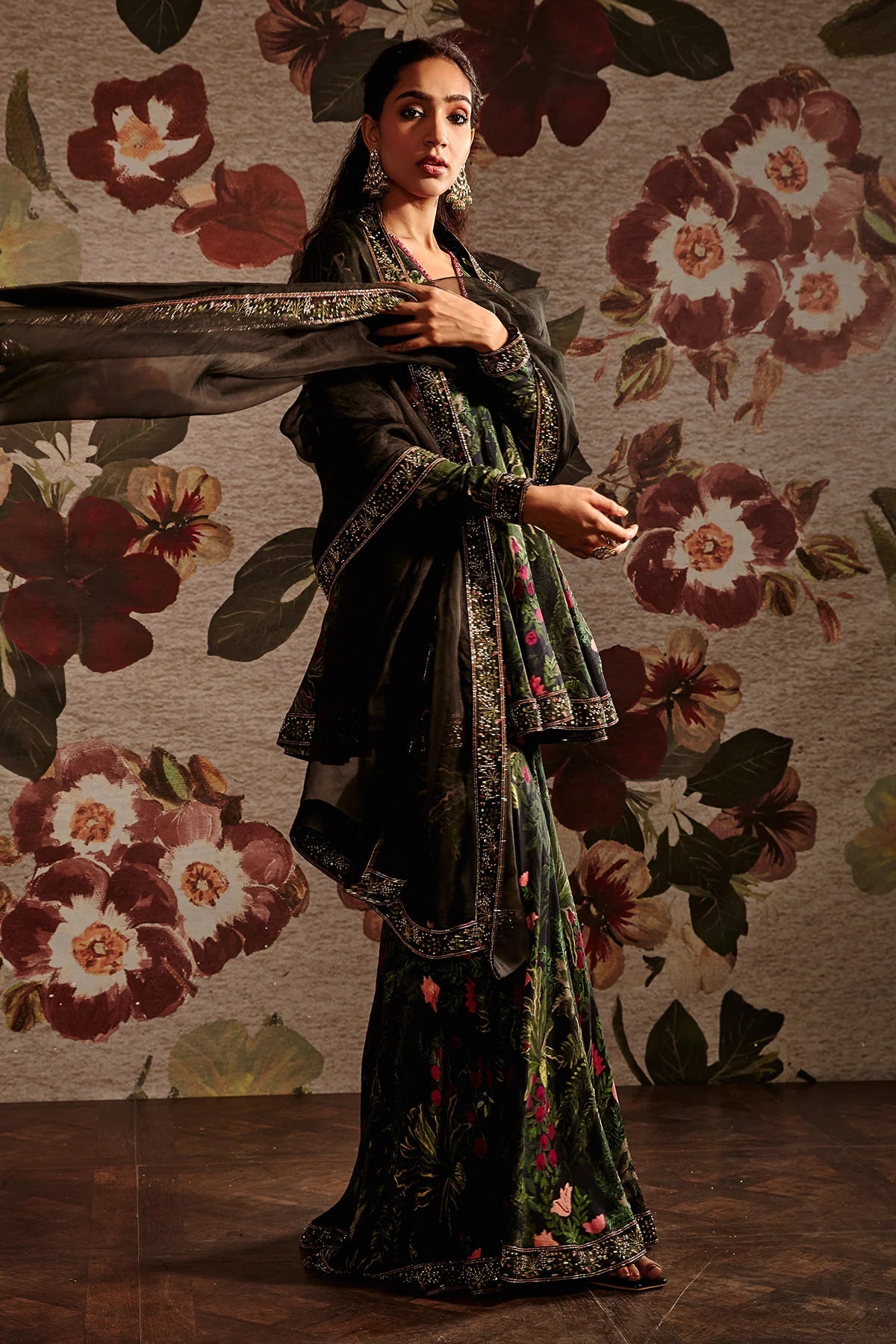 Gharara top with embellished neckline and embellished border on ghera and gharara pants as well as dupatta