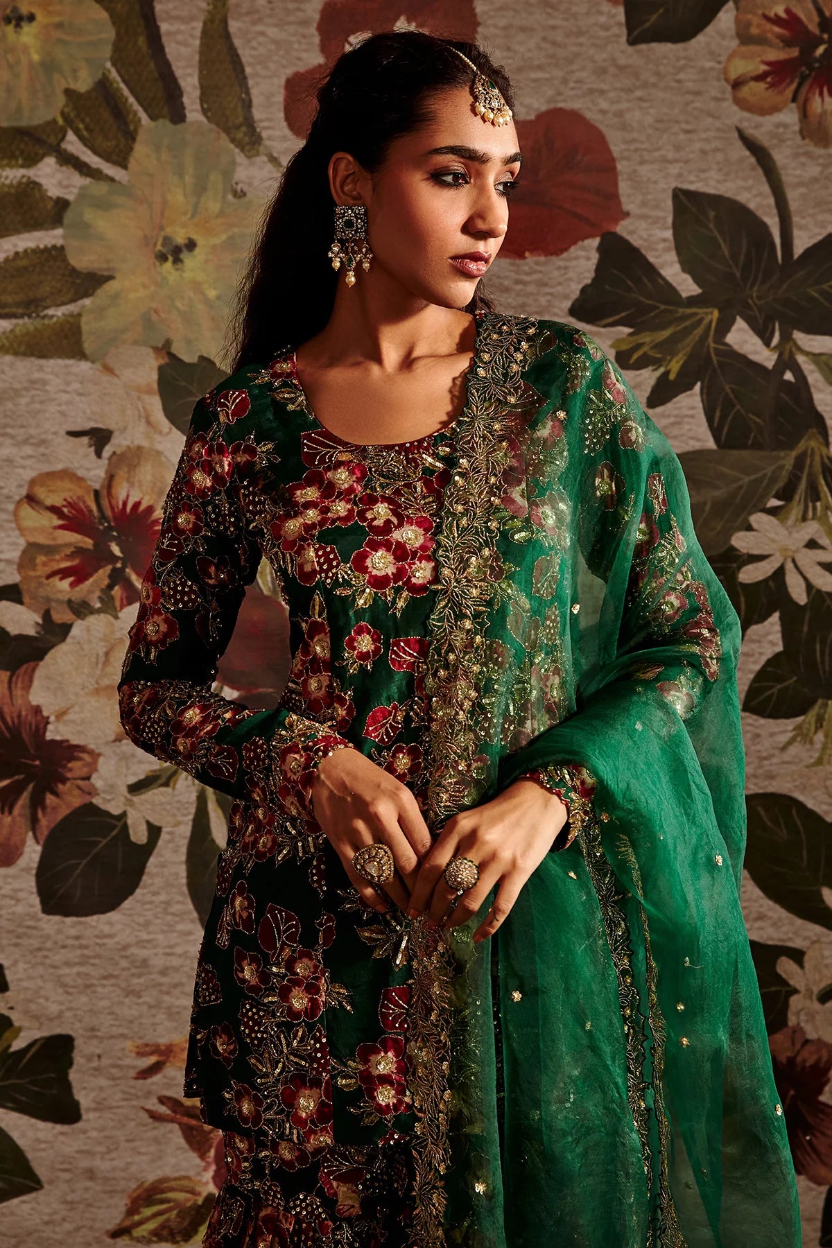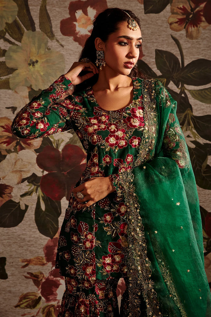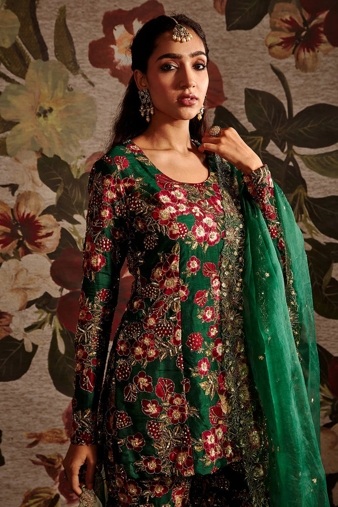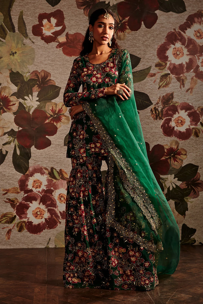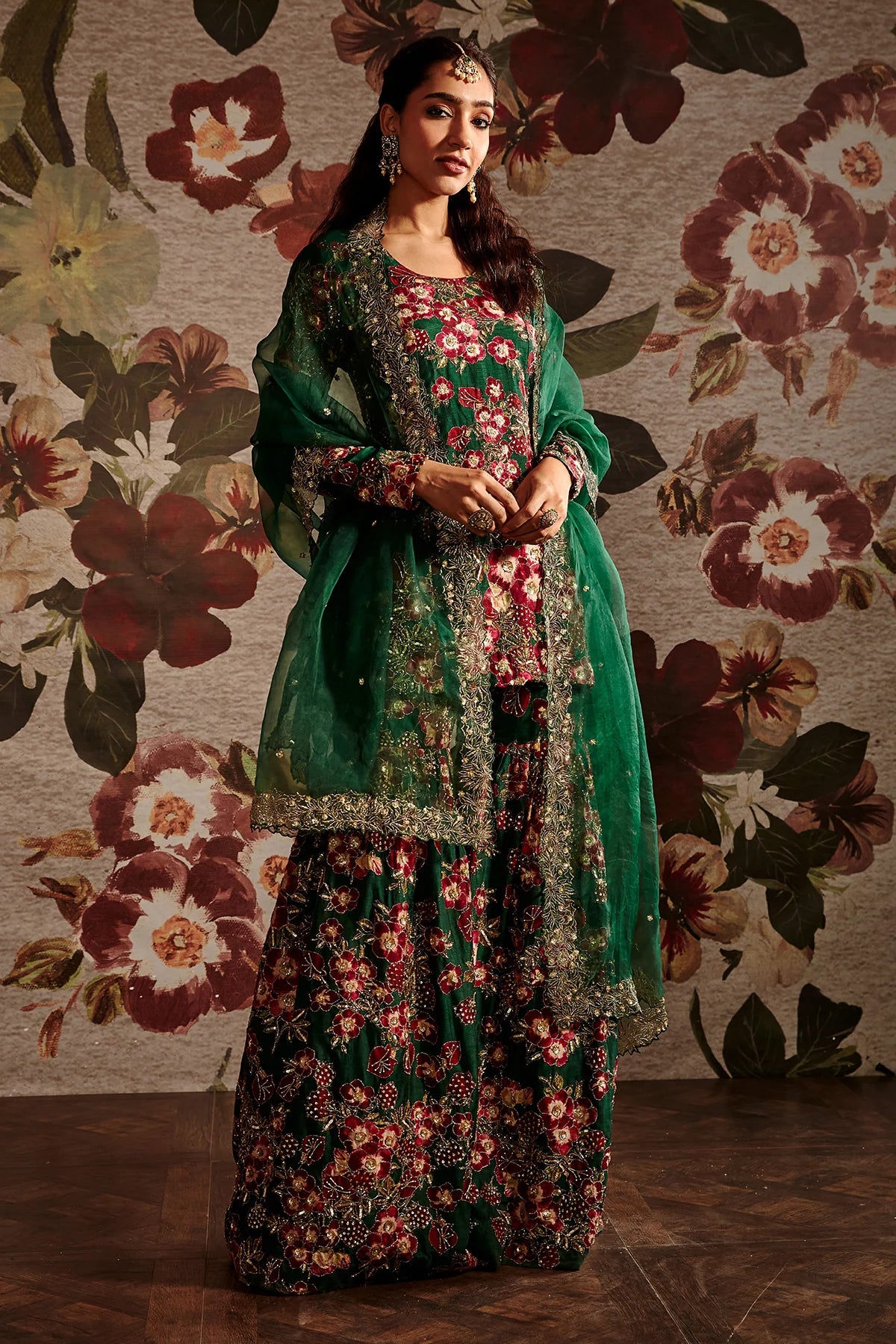 Heavily embroidered straight kurta and long embroidered gathered sharara pants with worked organza dupatta