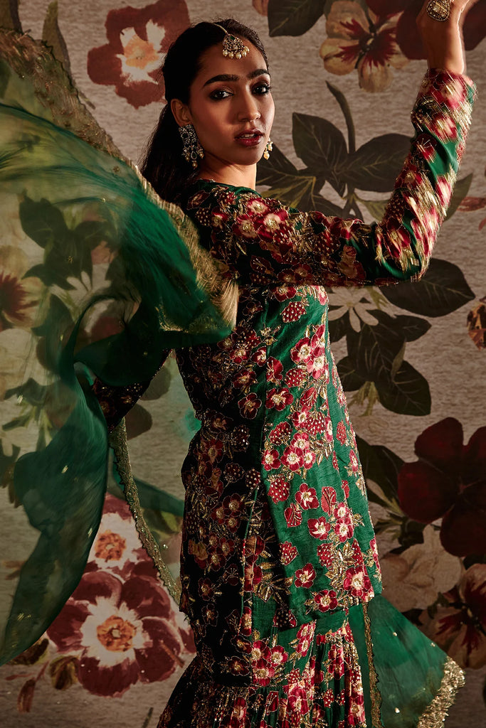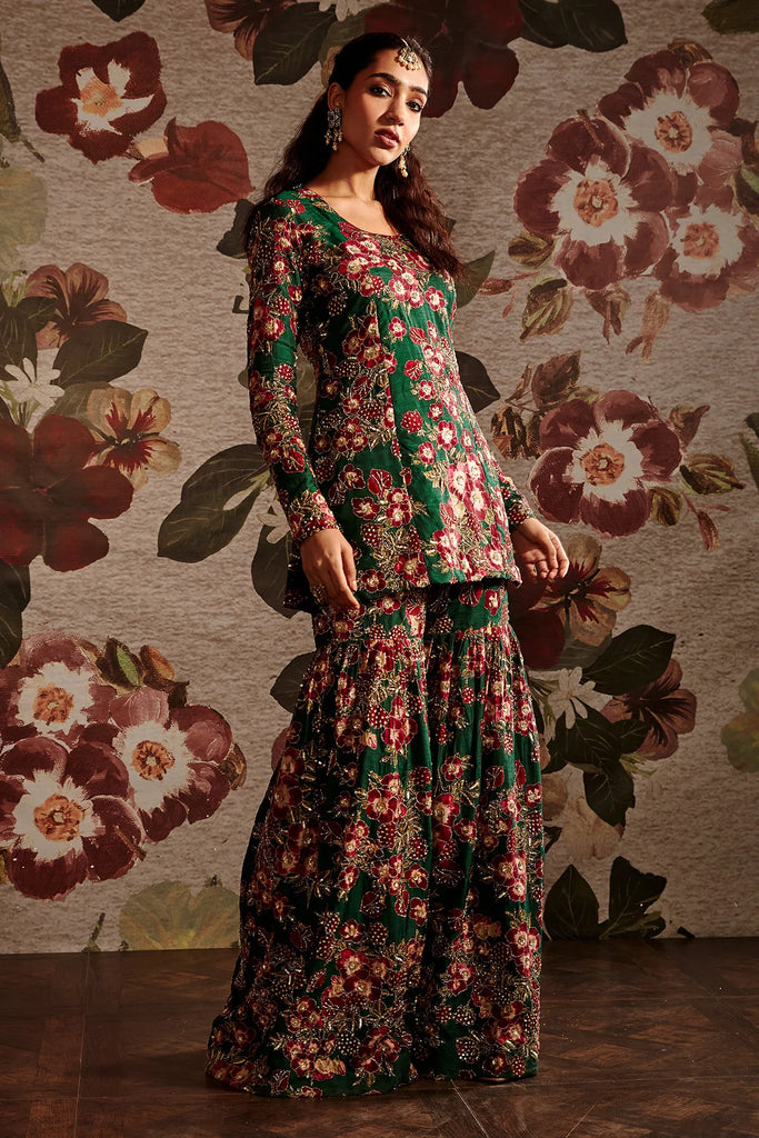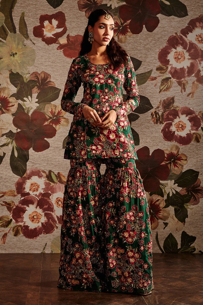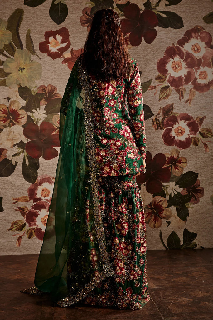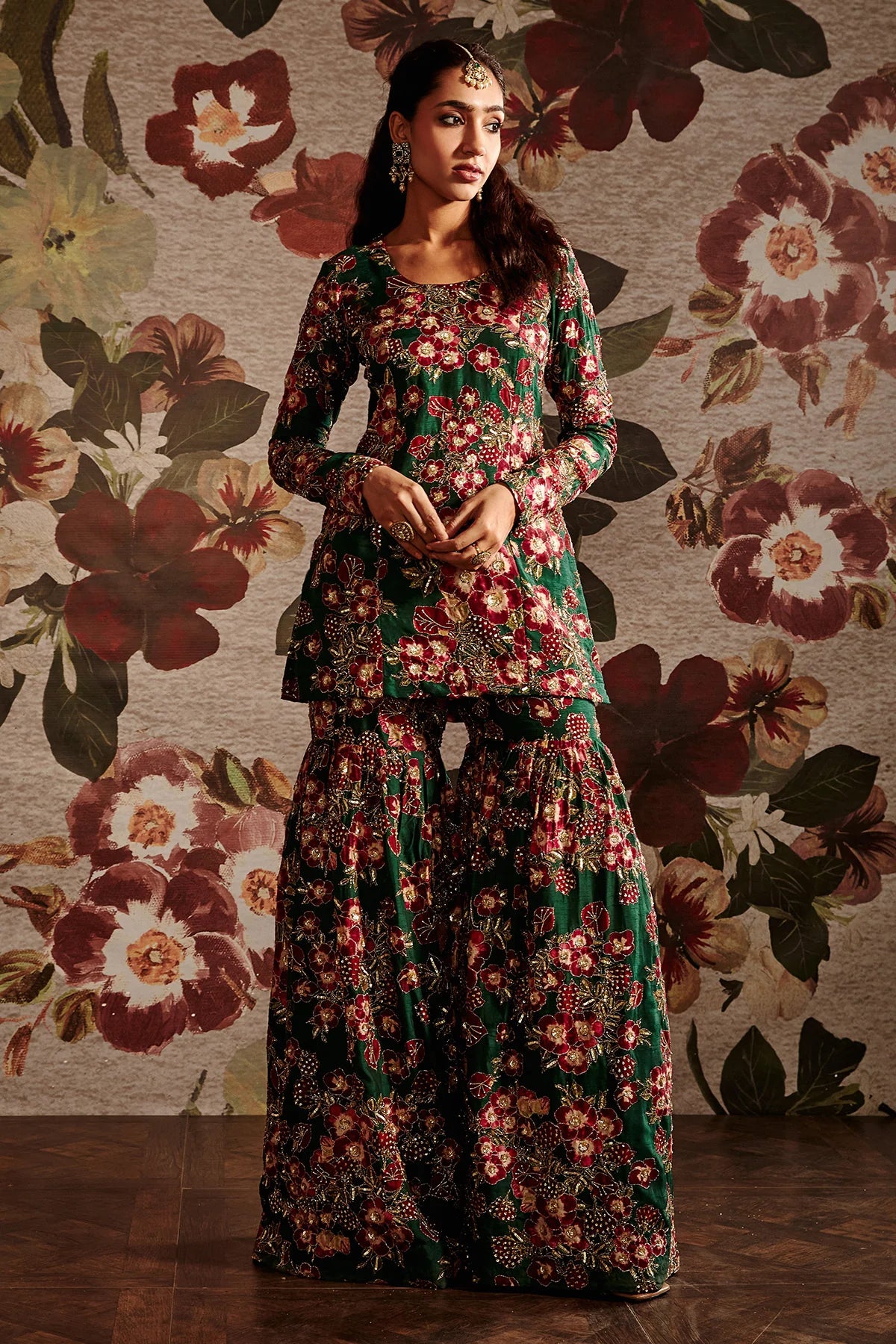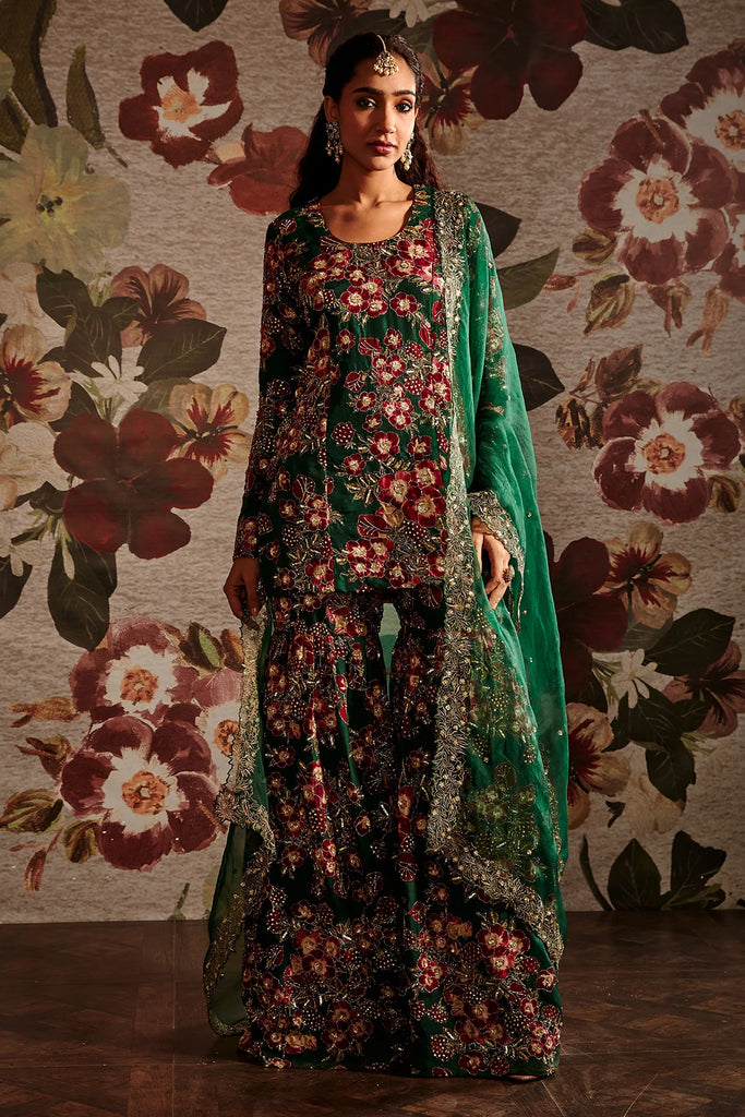 Heavily embroidered straight kurta and long embroidered gathered sharara pants with worked organza dupatta