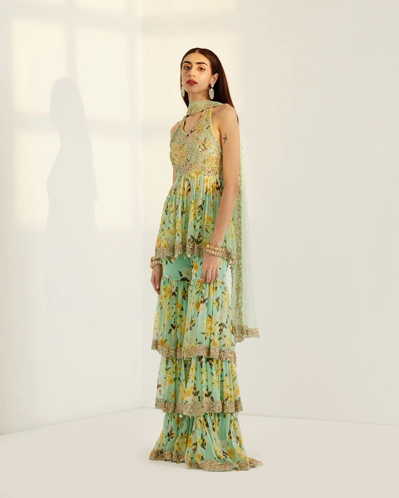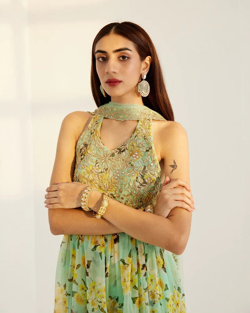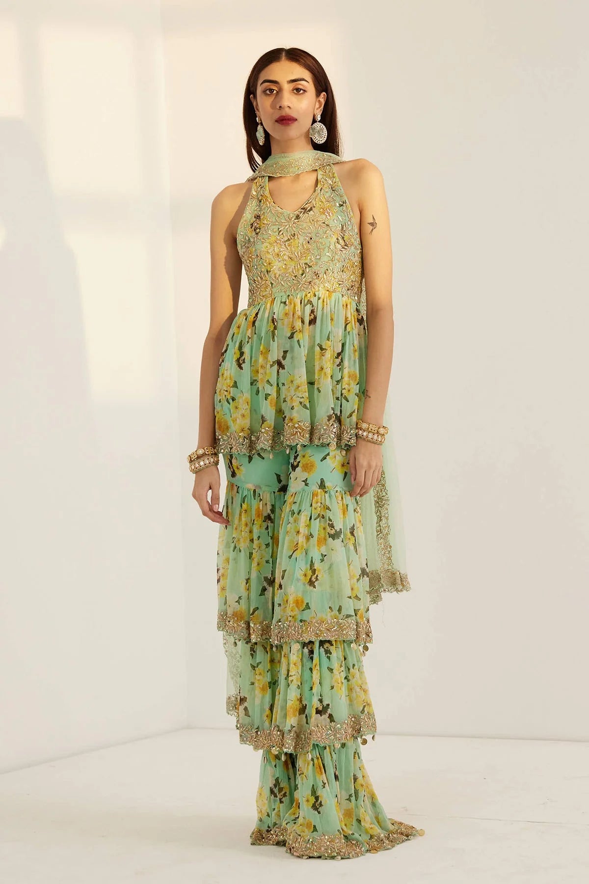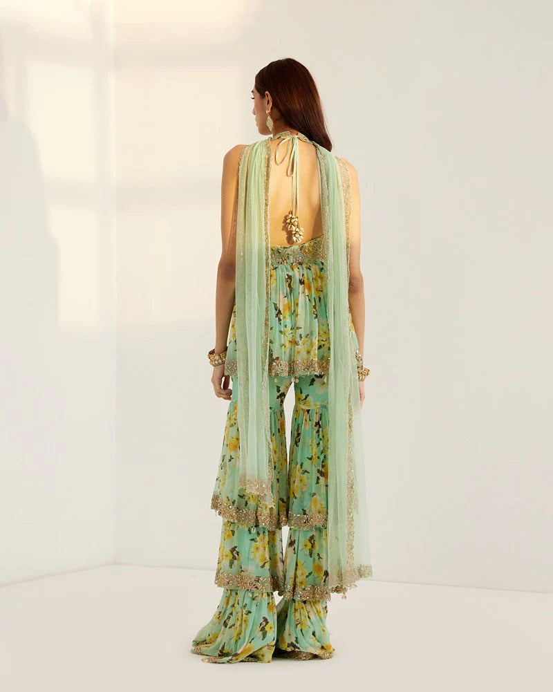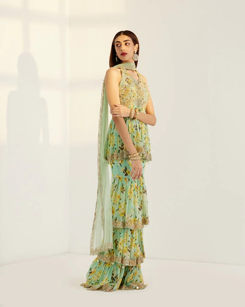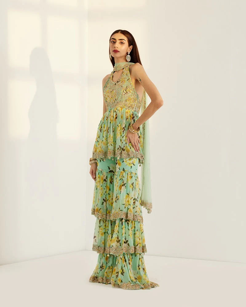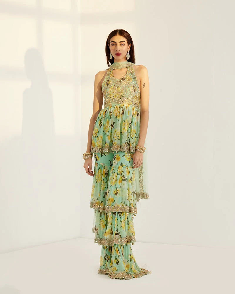 Heavily embroidered halter neck blouse with embellished dupatta and embellished tiered gharara pants