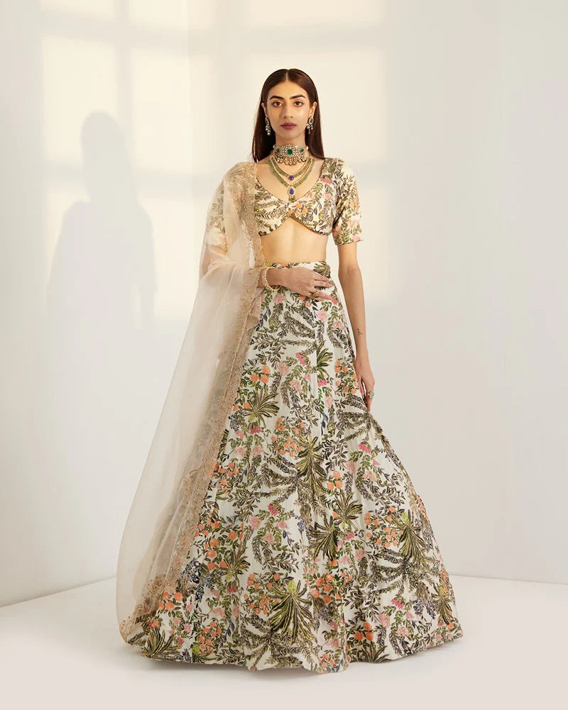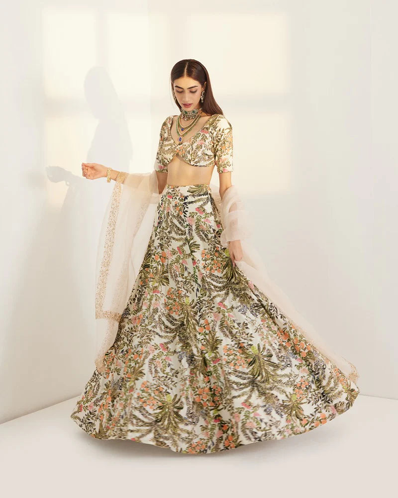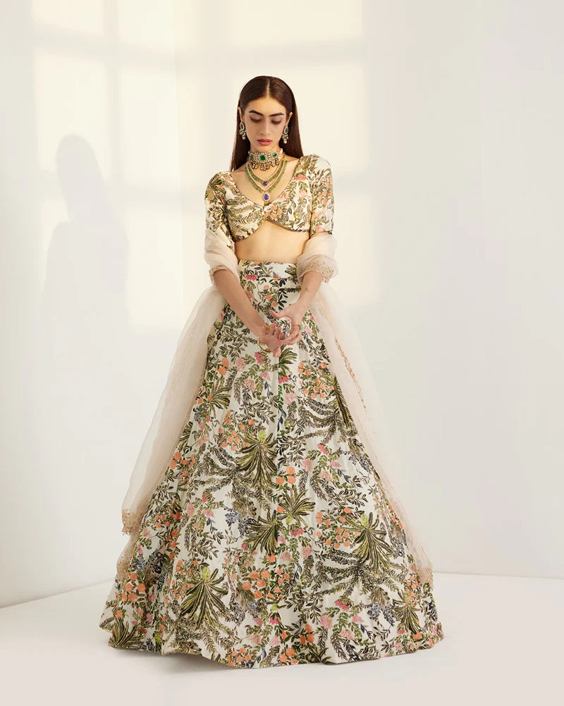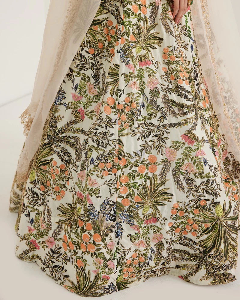 Heavily embroidered lehenga with double layer cancan, fully embroidered blouse, and worked organza dupatta.