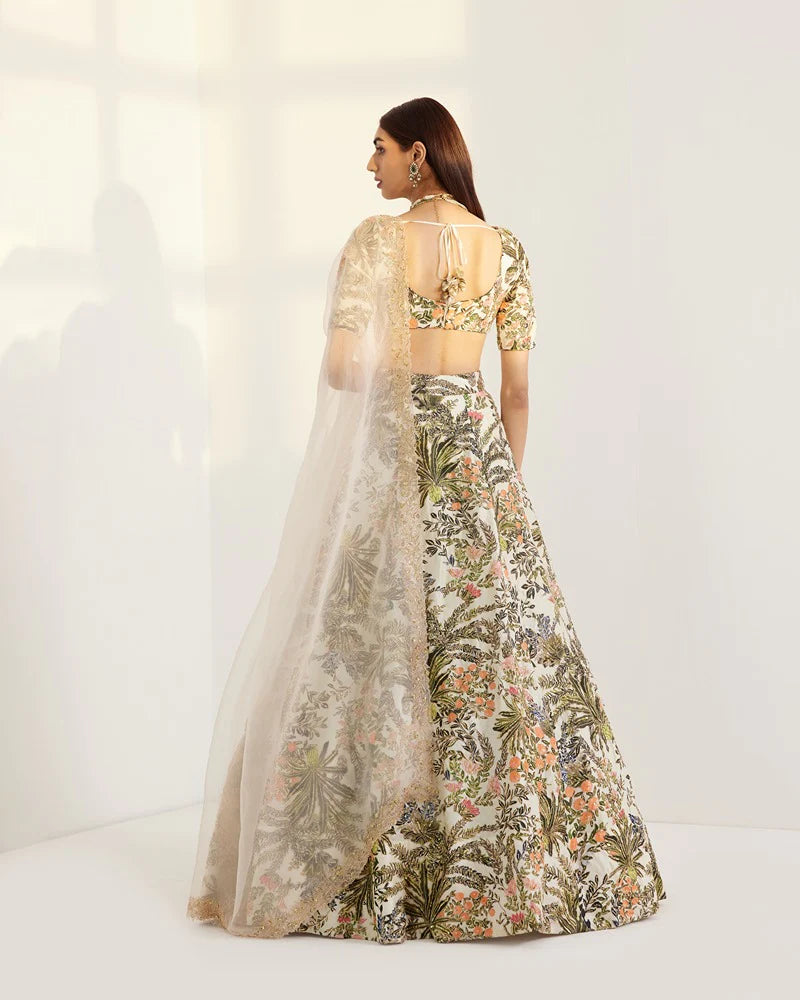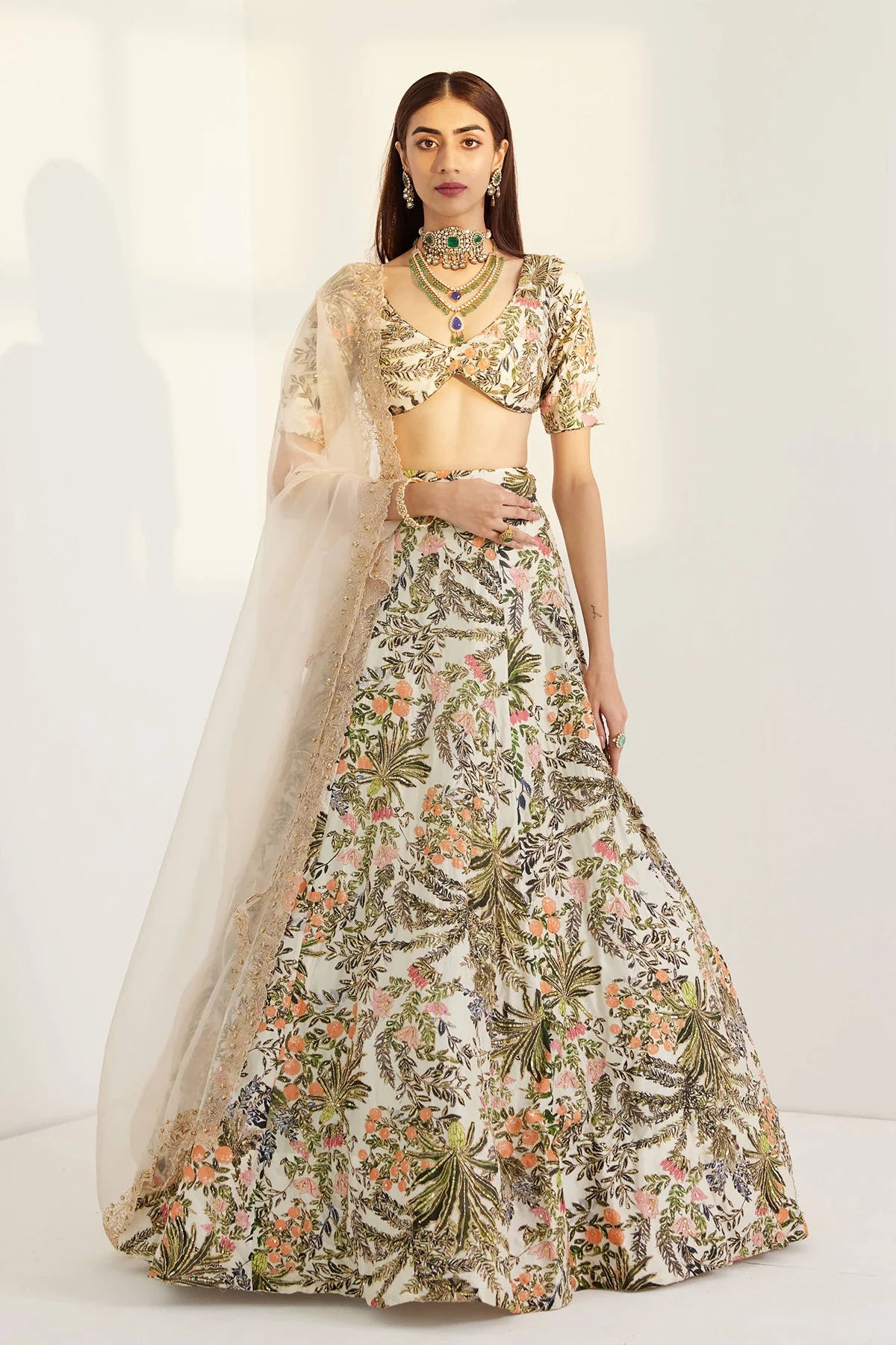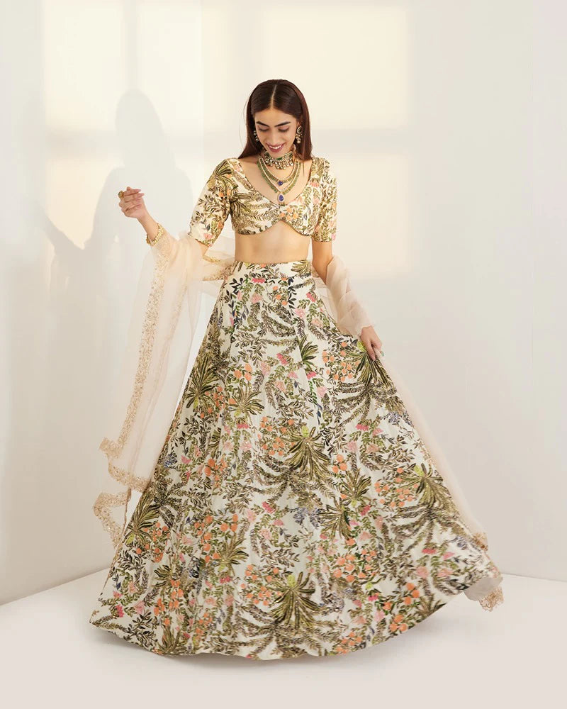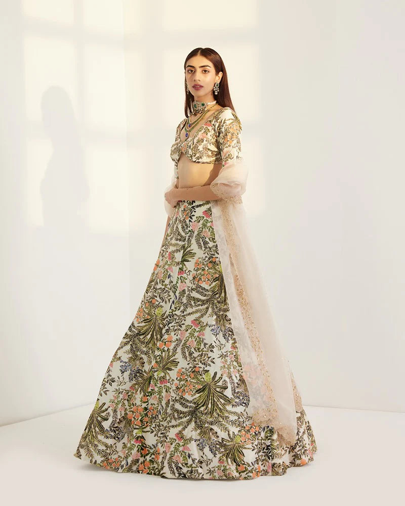 Heavily embroidered lehenga with double layer cancan, fully embroidered blouse, and worked organza dupatta.