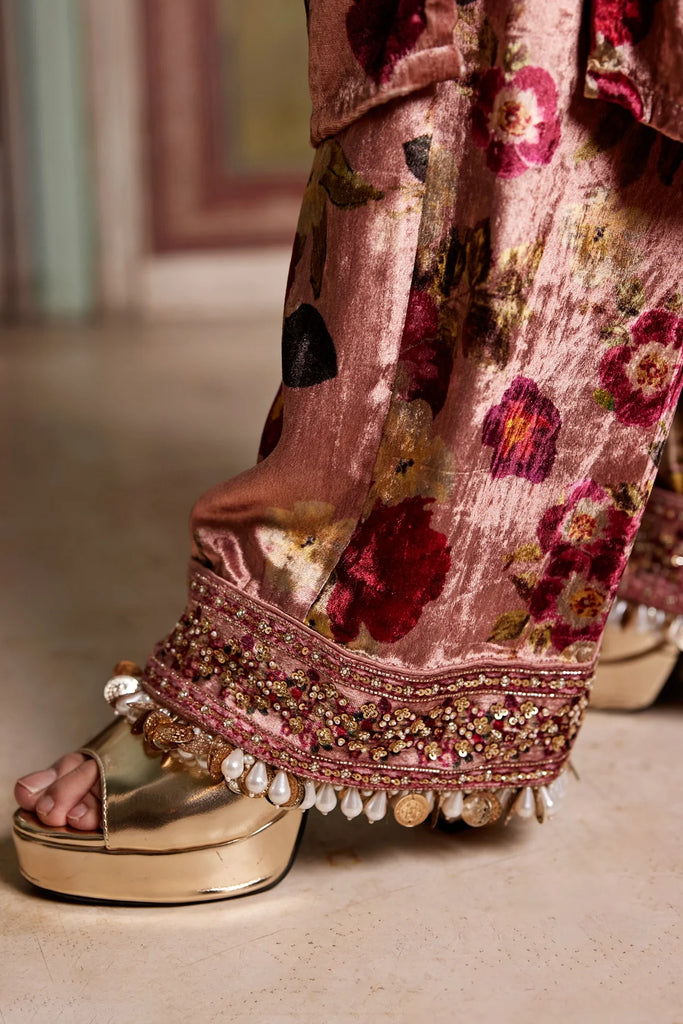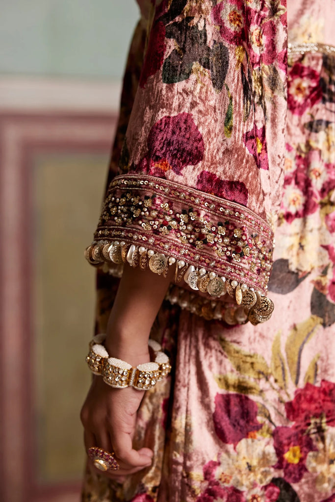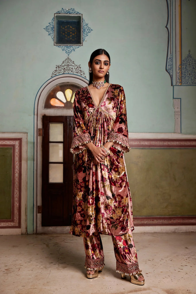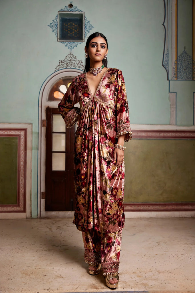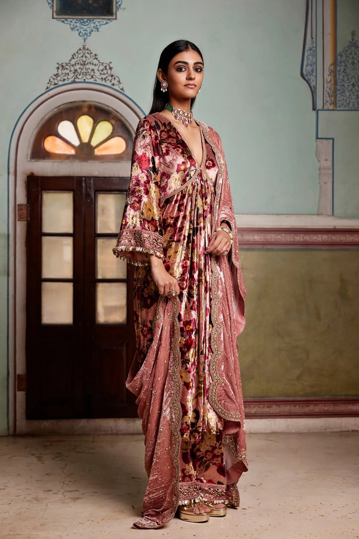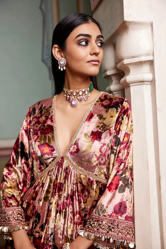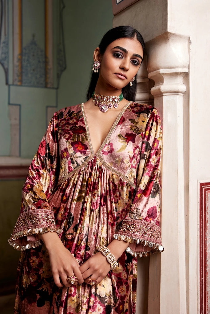 V neck kaftan with pants , there’s Hand embroidery on neckline , sleeves and pants borders. Additionally a velvet embroidered dupatta can be taken along for styling purposes finished by coin tassels and pearls